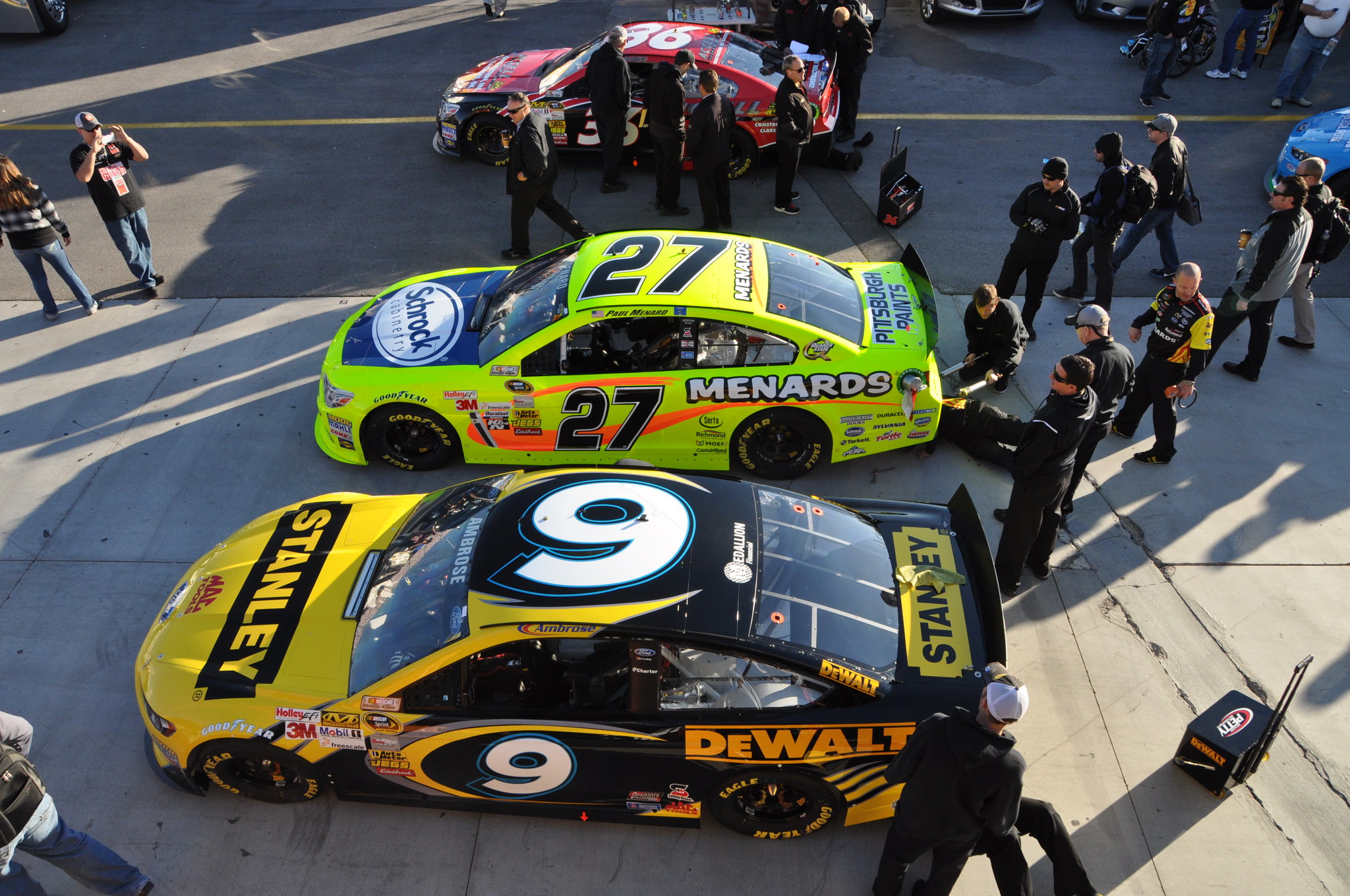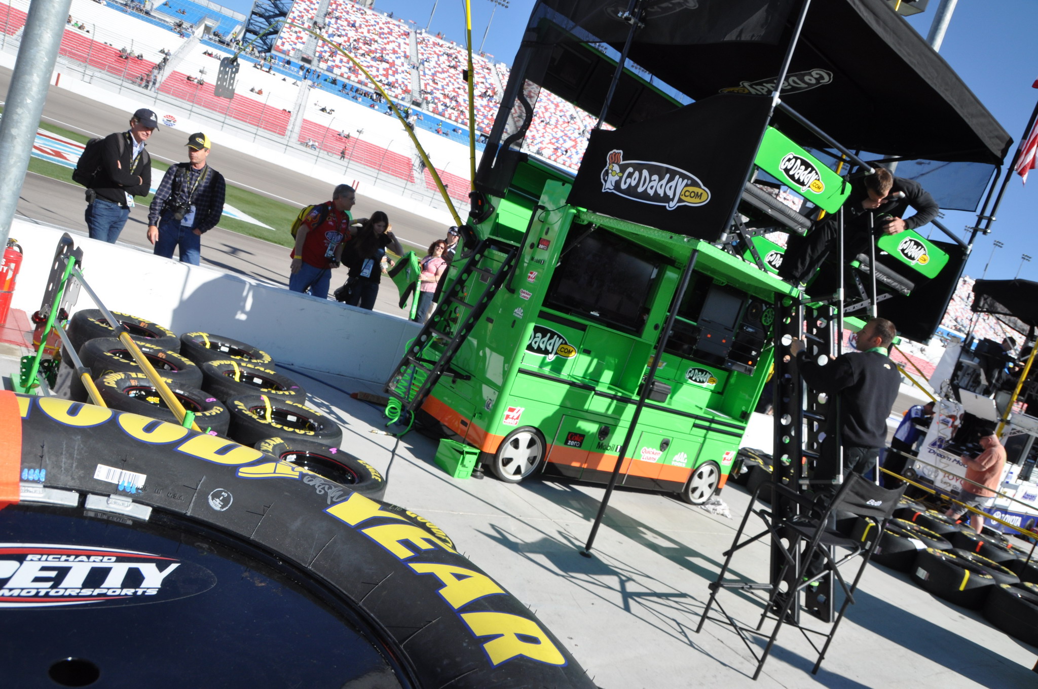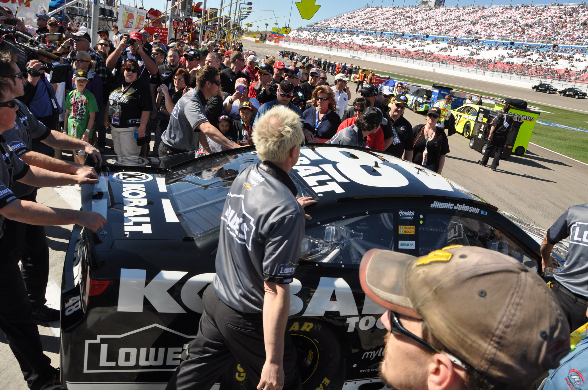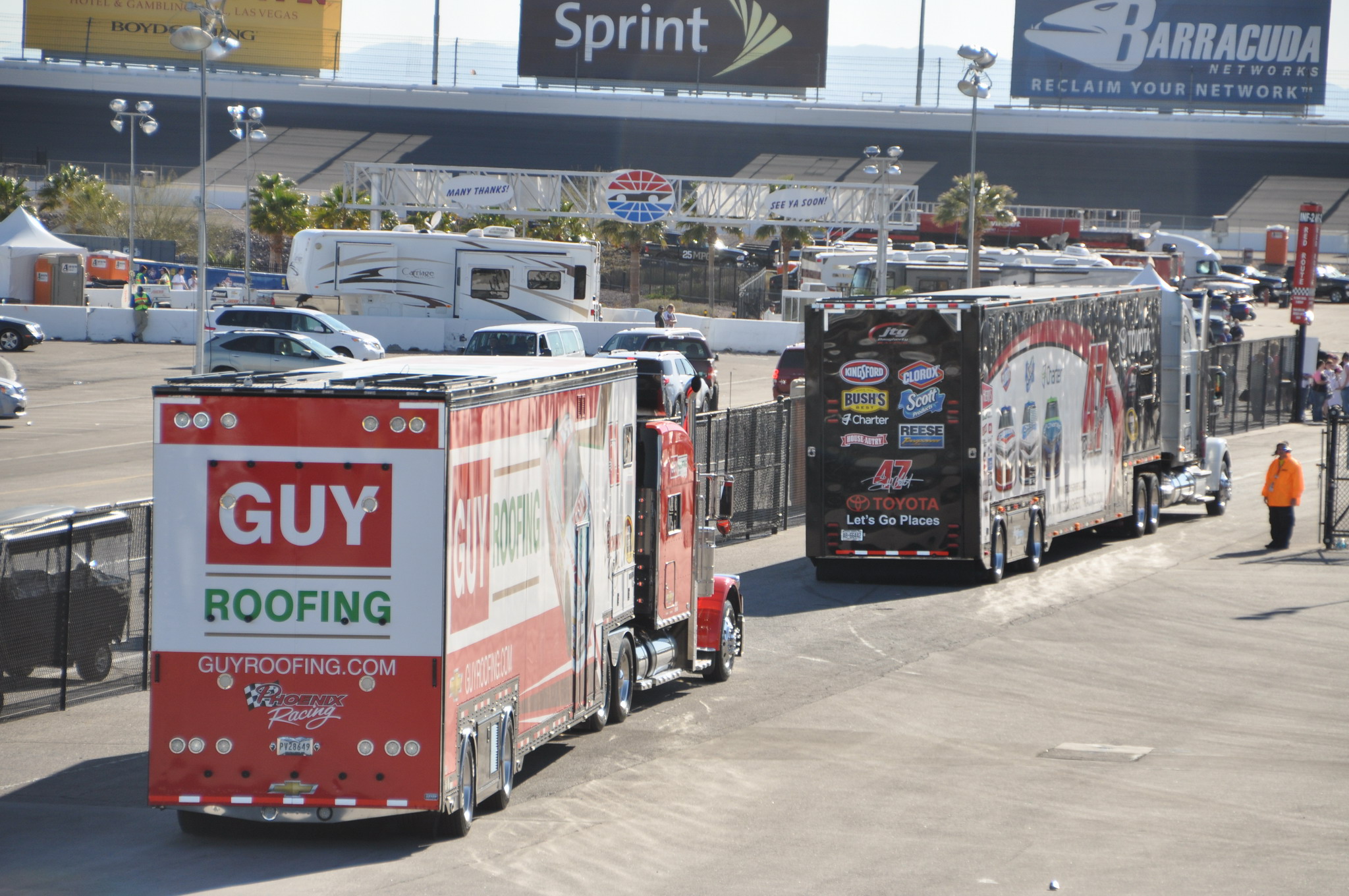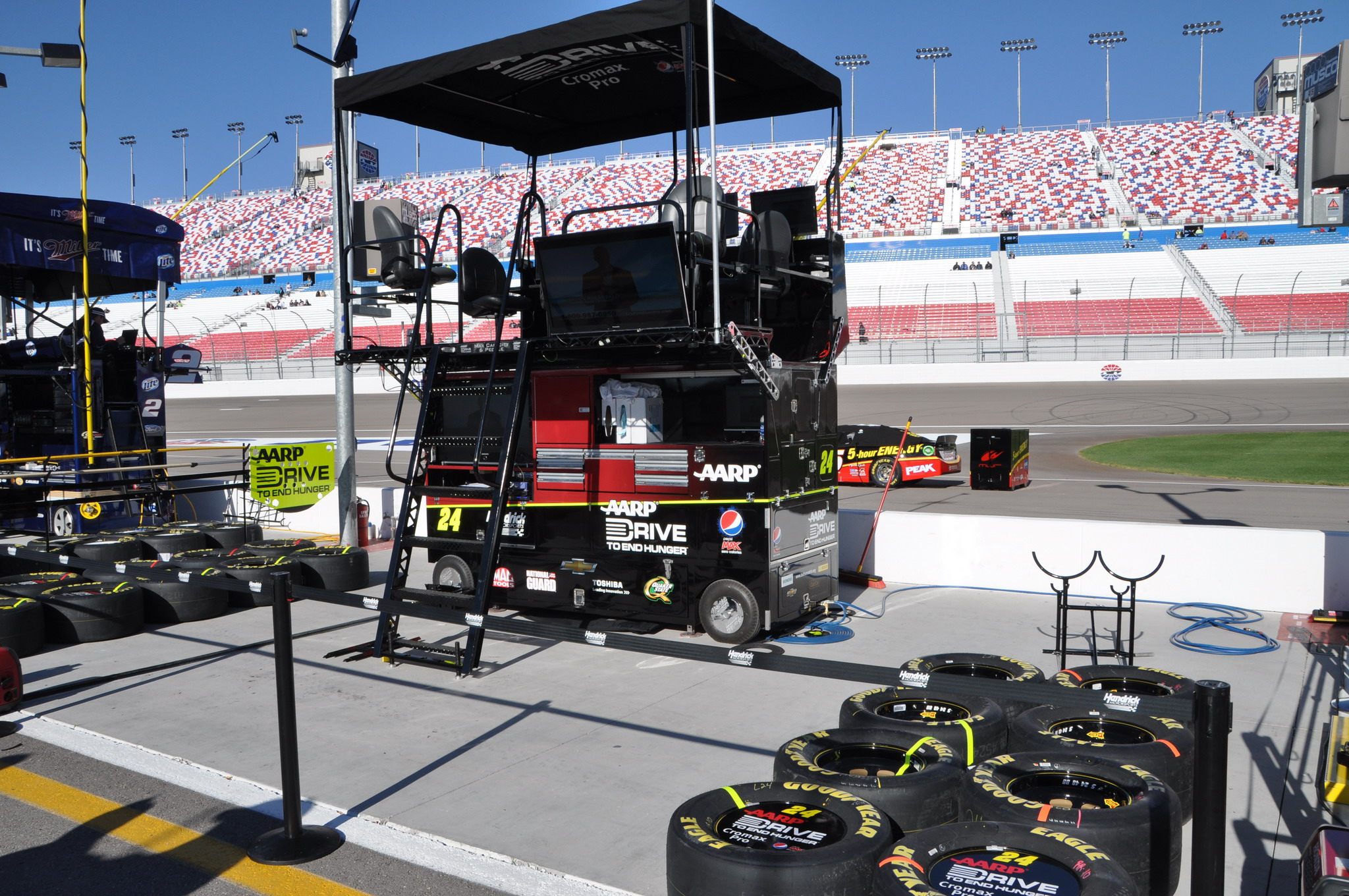 Et comme c'est de tradition le dimanche juste avant la course, et c'est aussi pour ça qu'on m'avait particulièrement conseillé la course de Vegas, toute la ligne des stands est ouverte aux fans. Les équipes, après l'inspection, y mettent les voitures, ce qui permet de toutes les voir de près, quelques animations sont organisées, avec un peu de chance, il est possible de voir les pilotes de près, le vrai spectacle de la Nascar pour les fans.