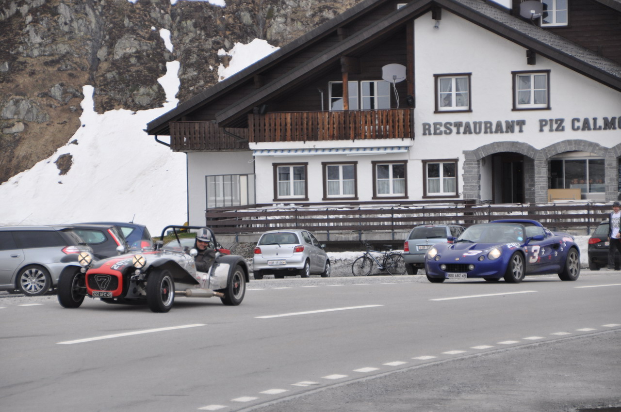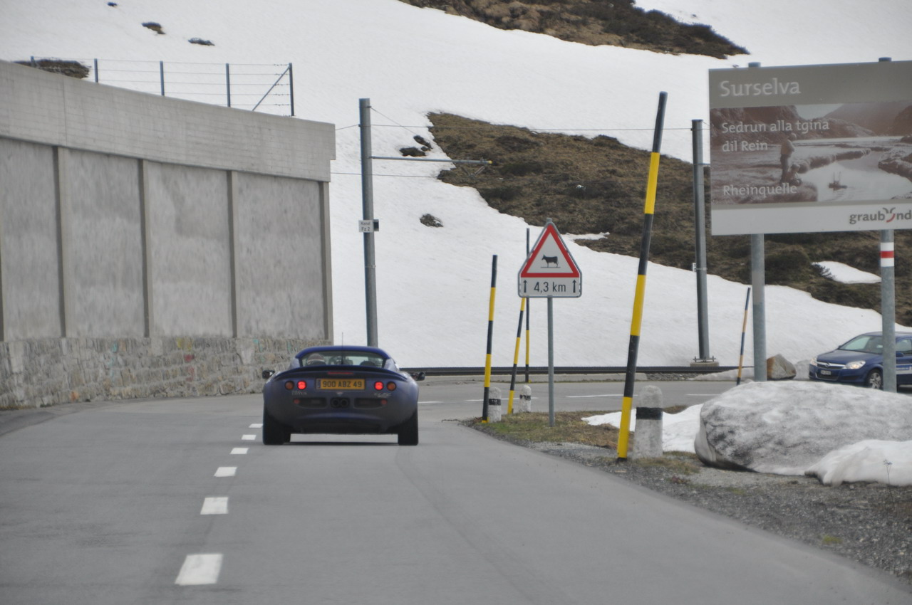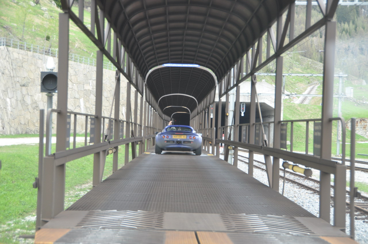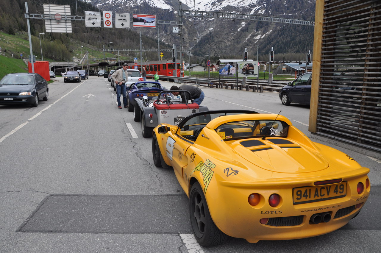 puis les choses allaient commencer à être sérieuses avec une ancienne connaissance qui nous avait bien enthousiasmé en 2011, le Furkapass .... mais mais mais .... y'a de la neige partout, le col est fermé !!!! donc pas le choix, une seule solution, prendre le train !!!! et sauf qu'on a failli ne pas pouvoir le prendre quand les gentils suisses nous ont vu arriver "non couverts" !!!! déjà limite avec les Elise, ils nous ont demandé de mettre un toit, on leur a dit qu'on en avait pas et qu'on roulait tout le temps cheveux aux vents !! mais quand ils ont vu la Cat sans pare-brise et sans portes, ils ont dit au Villo "mais ça va pas non !!!!", après moultes tractations, ils acceptent de le faire monter mais la Cat restera à la queue du train et le Villo dans le compartiment voyageurs alors que nous restons dans nos voitures, traversée un peu funky à travers la montagne !!