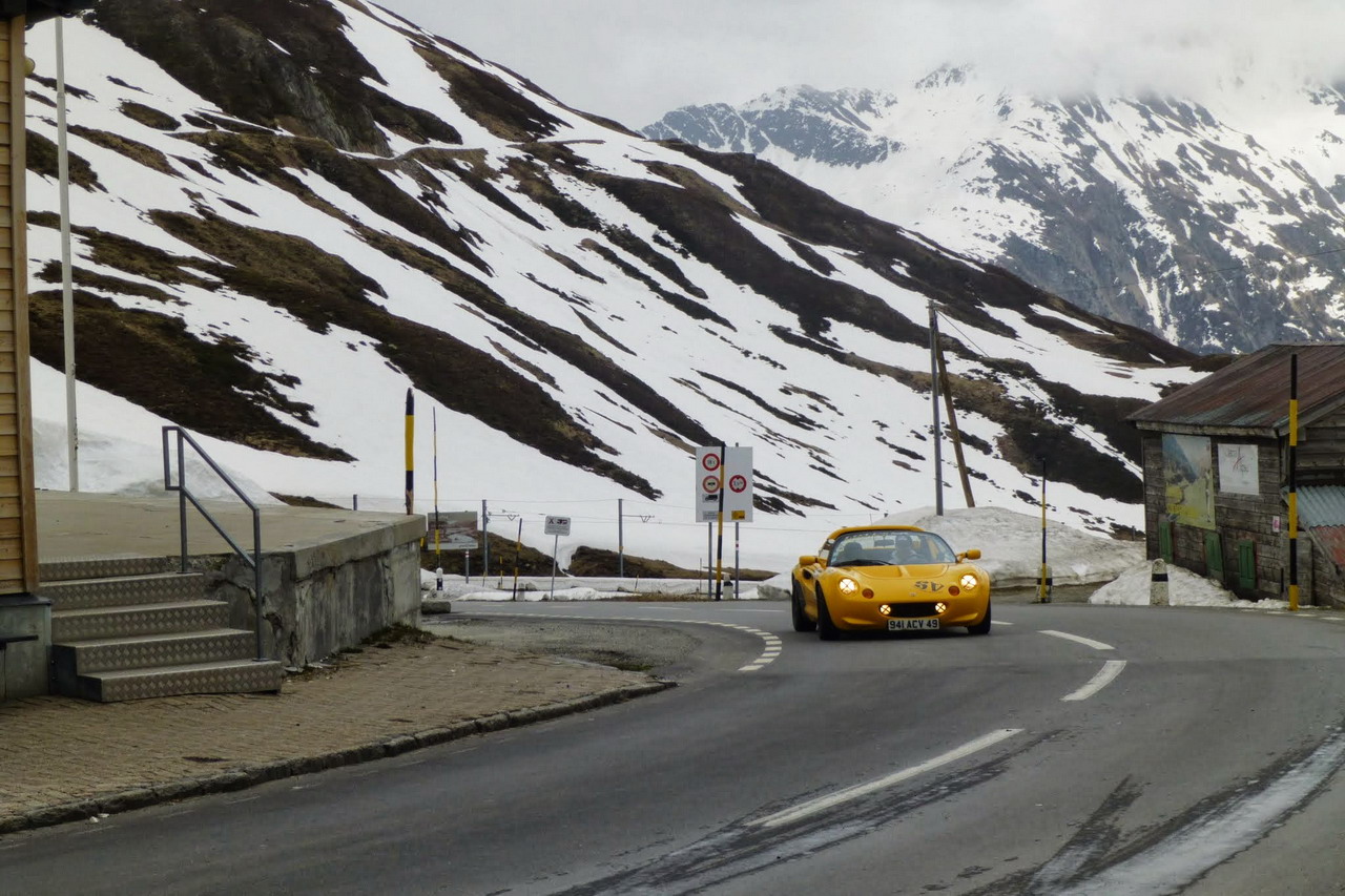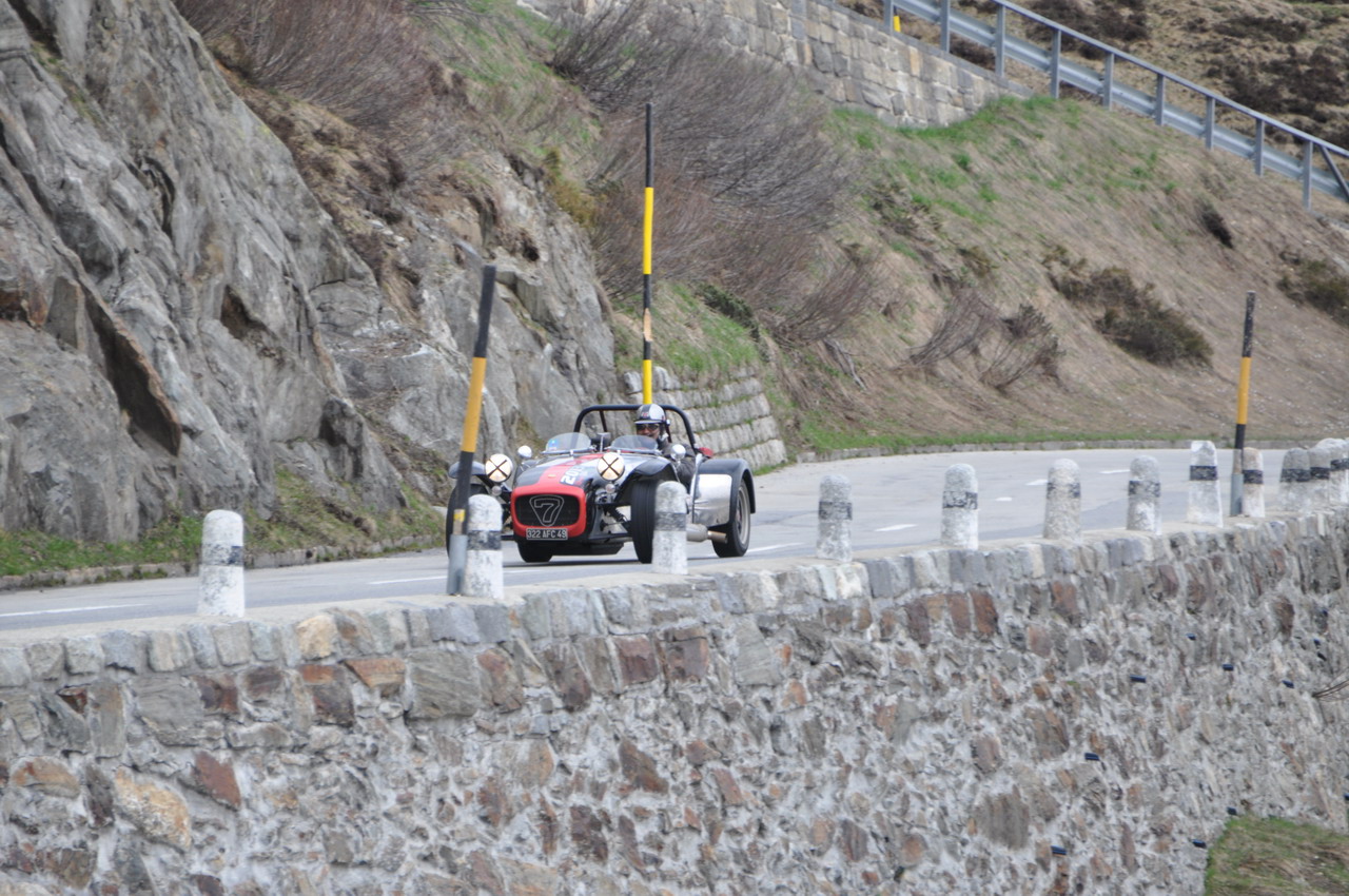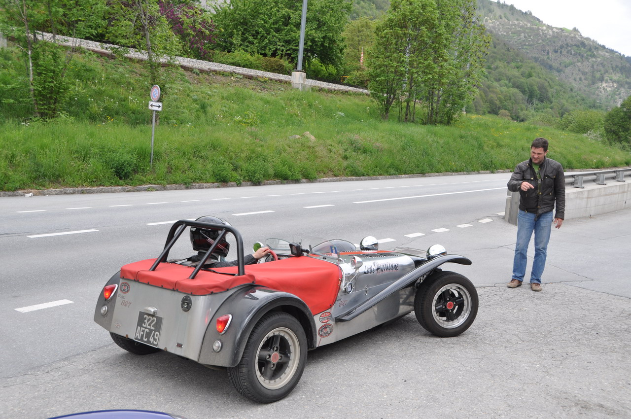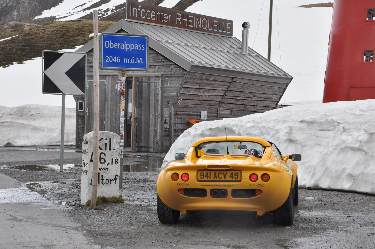 puis les choses allaient commencer à être sérieuses avec une ancienne connaissance qui nous avait bien enthousiasmé en 2011, le Furkapass .... mais mais mais .... y'a de la neige partout, le col est fermé !!!! donc pas le choix, une seule solution, prendre le train !!!! et sauf qu'on a failli ne pas pouvoir le prendre quand les gentils suisses nous ont vu arriver "non couverts" !!!! déjà limite avec les Elise, ils nous ont demandé de mettre un toit, on leur a dit qu'on en avait pas et qu'on roulait tout le temps cheveux aux vents !! mais quand ils ont vu la Cat sans pare-brise et sans portes, ils ont dit au Villo "mais ça va pas non !!!!", après moultes tractations, ils acceptent de le faire monter mais la Cat restera à la queue du train et le Villo dans le compartiment voyageurs alors que nous restons dans nos voitures, traversée un peu funky à travers la montagne !!