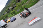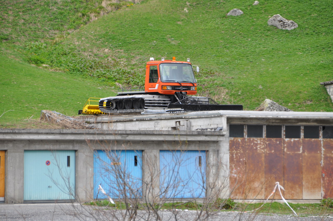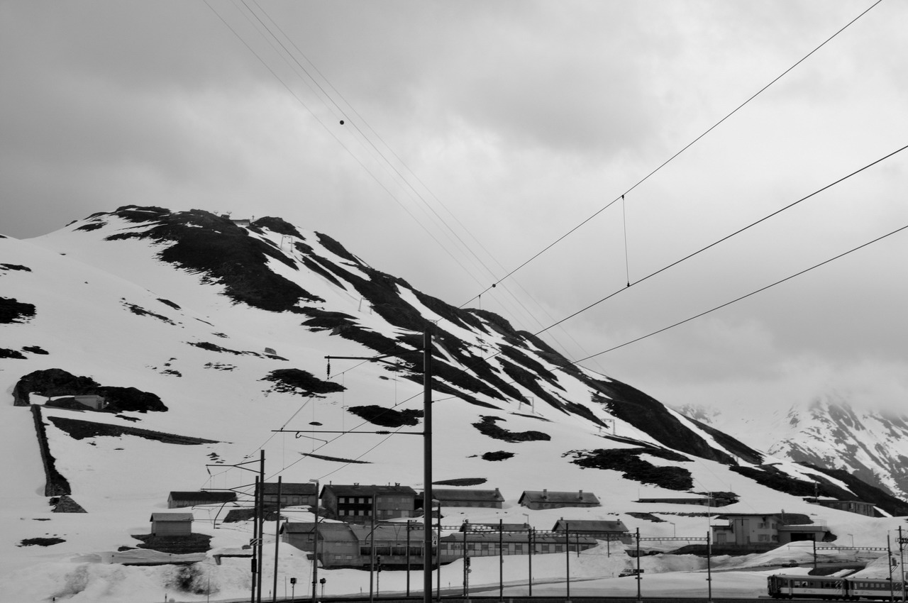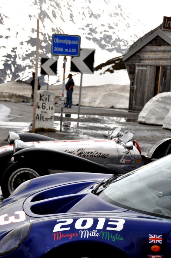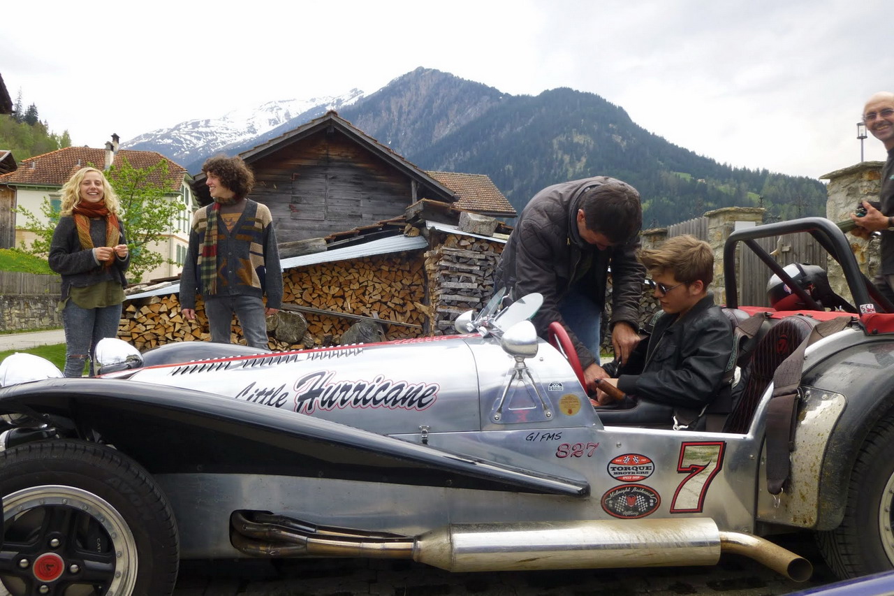 puis les choses allaient commencer à être sérieuses avec une ancienne connaissance qui nous avait bien enthousiasmé en 2011, le Furkapass .... mais mais mais .... y'a de la neige partout, le col est fermé !!!! donc pas le choix, une seule solution, prendre le train !!!! et sauf qu'on a failli ne pas pouvoir le prendre quand les gentils suisses nous ont vu arriver "non couverts" !!!! déjà limite avec les Elise, ils nous ont demandé de mettre un toit, on leur a dit qu'on en avait pas et qu'on roulait tout le temps cheveux aux vents !! mais quand ils ont vu la Cat sans pare-brise et sans portes, ils ont dit au Villo "mais ça va pas non !!!!", après moultes tractations, ils acceptent de le faire monter mais la Cat restera à la queue du train et le Villo dans le compartiment voyageurs alors que nous restons dans nos voitures, traversée un peu funky à travers la montagne !!