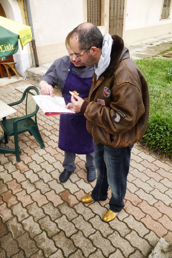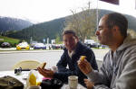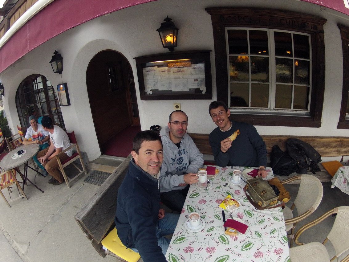 bon, l'histoire se répète un peu, comme hier, en fait, les machines sont dures à mettre en route .... donc premier pit-stop après 10 bornes !! on arrive à Mouthe (je répète le village le plus froid de France pour ceux qui suivent pas!!) et on trouve un piti bistrot avec terrasse pour déguster des bons pitis pains au chocolat et un bon chocolat chaud, le bonheur !! et un tavernier qui nous indique la route à suivre, que demander de plus ??