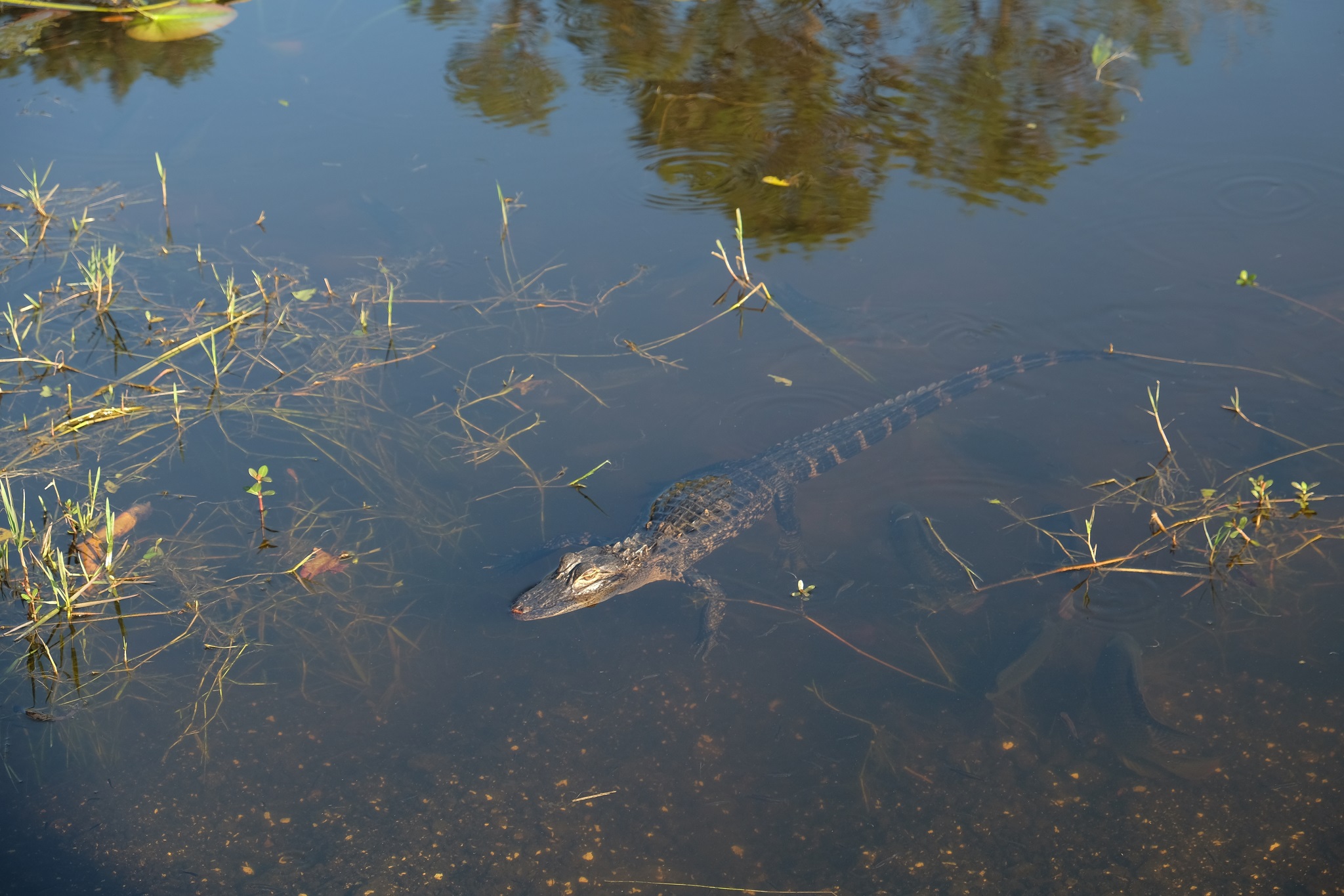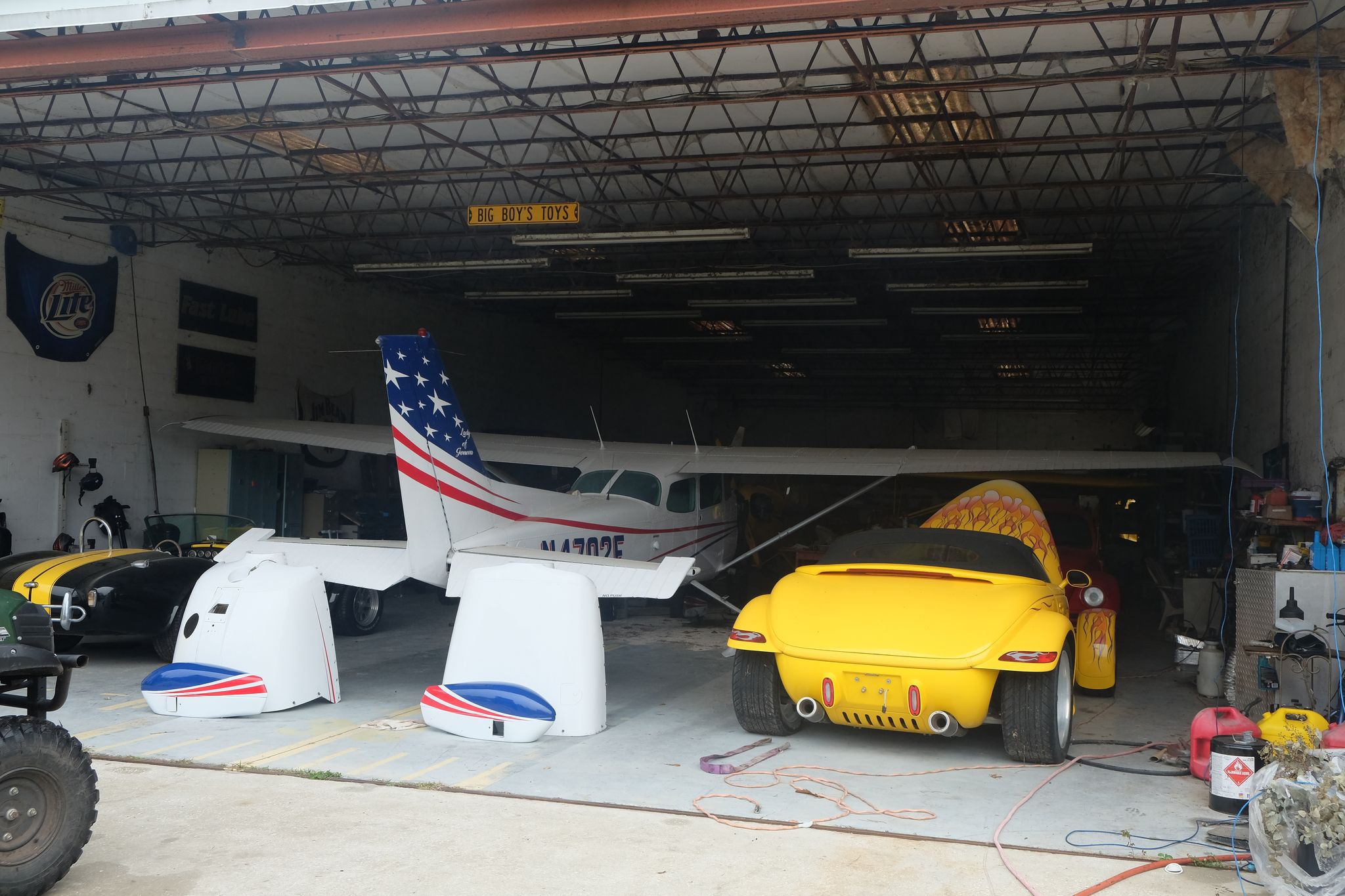 Nous avons passé les deux premières nuits dans un Airbnb assez atypique qui s'appelle Man Cave situé à Geneva (!), un lieu un peu improbable et typiquement à l'américaine, c'est en fait un hangar à avions (la piste en herbe est juste de l'autre coté de la route!) dans lequel le proprio a aménagé une sorte de studio, avec une foultitude d'objets, qui a eux seuls mériteraient quelques heures à détailler, et l'espace extérieur est très grand, avec du bric-à-brac de partout, pas mal orienté automobile et aviation, on réalise bien dans ce genre d'endroit que les ricains ont souvent beaucoup d'espace, de terrain, et donc ils ne jettent rien et stockent tout n'importe où et n'importe comment! Et ici, juste en face le Man cave, il y a même le gardien des lieux dans la mare, un alligator, heureusement assez petit pour le moment !