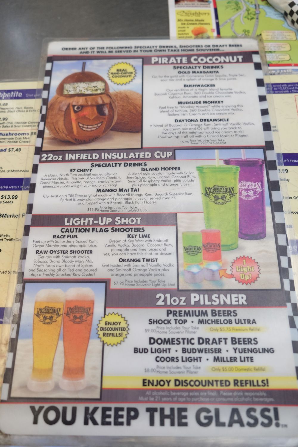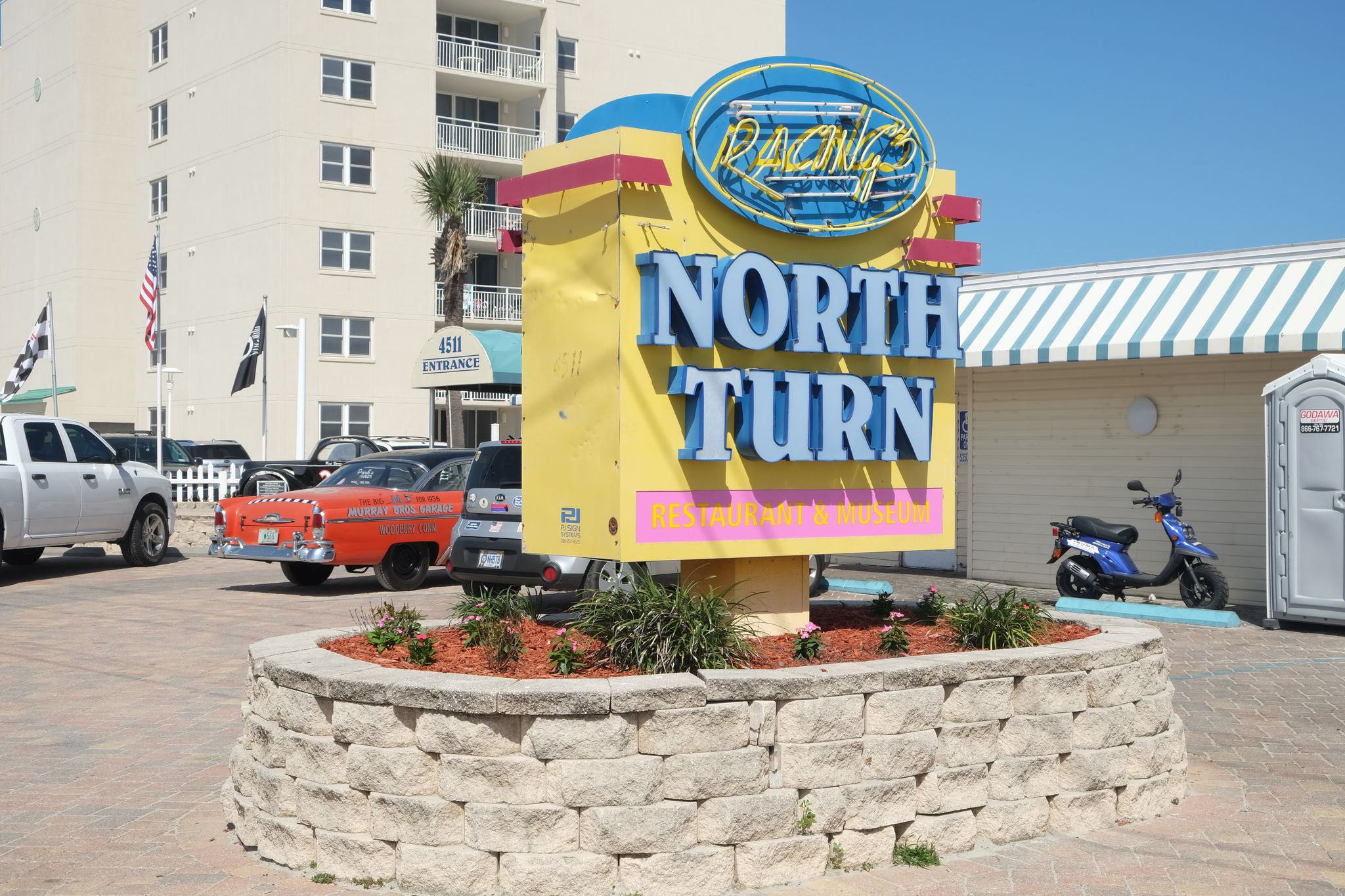 Autre lieu incontournable, LE lieu où tout a commencé, à l'époque où les "vraies" courses se faisaient sur la plage, situé au nord de Daytona Beach, les voitures parcouraient plusieurs miles sur la plage du nord vers le sud, puis empruntaient la route pour remonter le long de la plage, le virage de la sortie de la plage est le célèbre "North Turn", où sévit maintenant un resto dédié Nascar lui aussi, le North Turn.