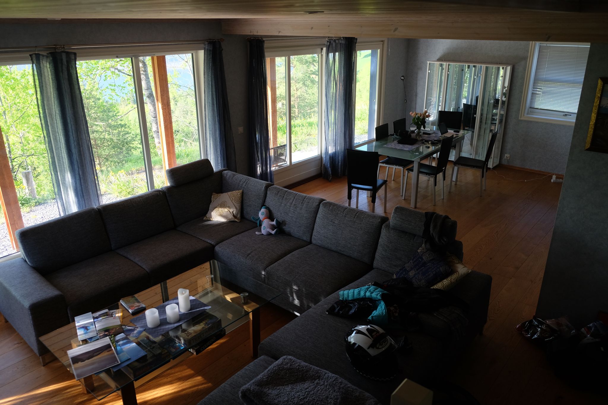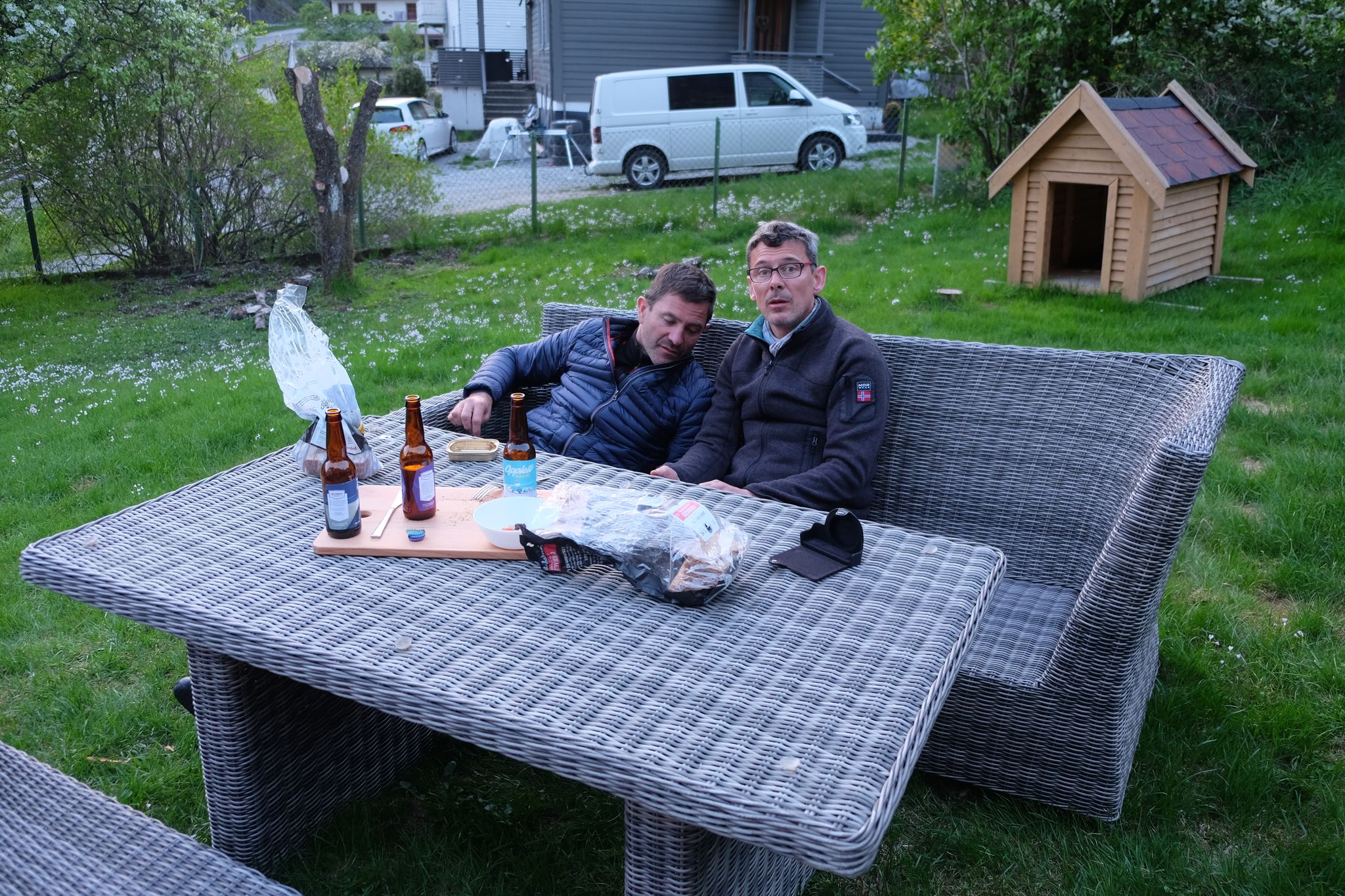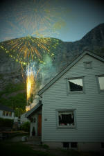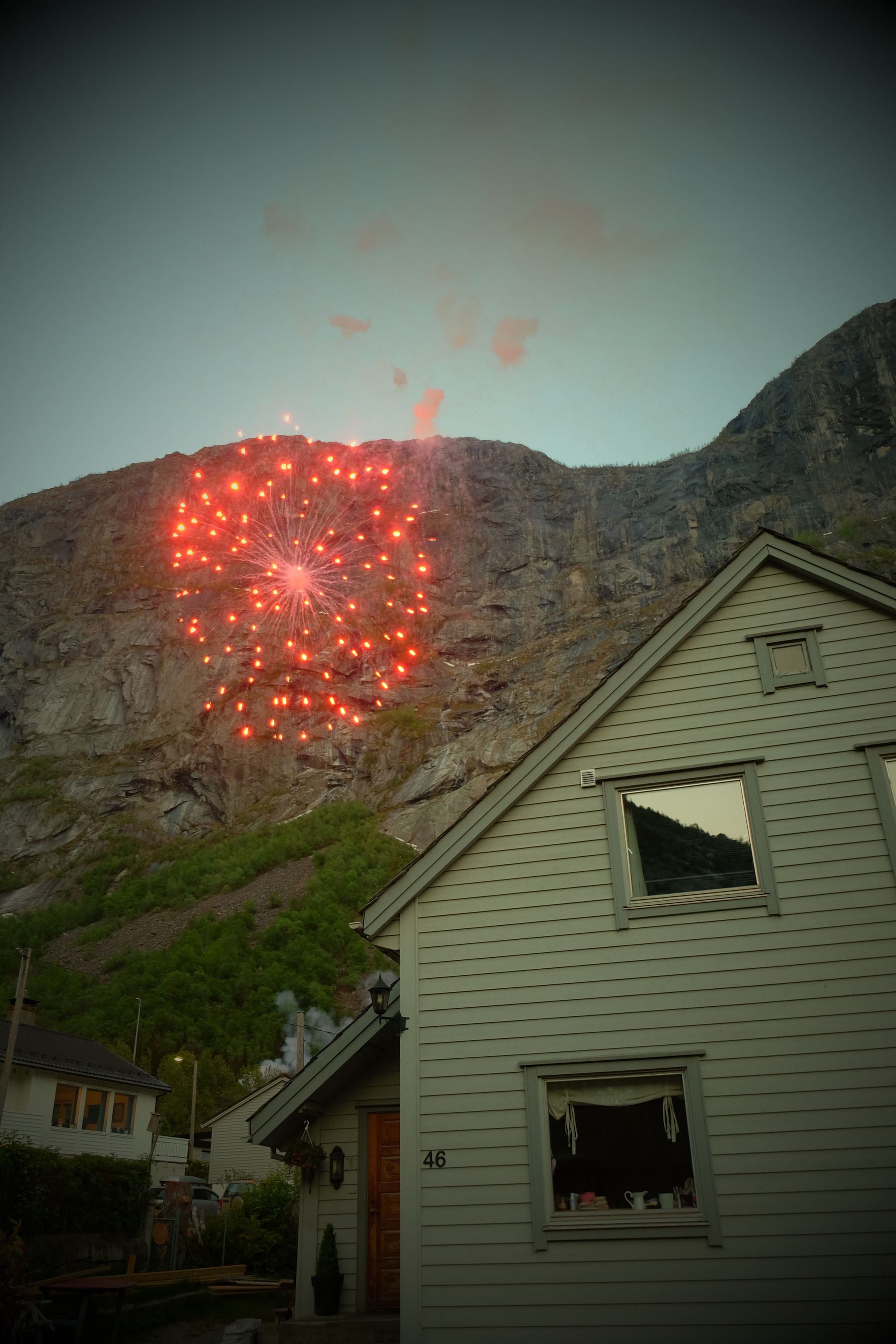 Nous commençons à approcher de notre dodo mais il est déjà tard, plus de 20h00, nous longeons le très beau fjord Hardangerfjorden sur de nombreux kilomètres, à l'ombre car celui-ci est assez encaissé et bordé de vertigineuses falaises, et difficile de rouler vite sur cette route un peu étroite, des nombreuses zones de travaux offrant en plus du vrai off-road, et nous atteignons enfin Tyssedal, petite ville nichée au pied des falaises et au bord du fjord, et avec un peu de difficultés, nous trouvons notre airbnb, la jolie maison de la famille d'Elisabeth Michelle, avec qui j'avais eu de chaleureux échanges lors de ma réservation, mais malheureusement, elle est absente à cause de son boulot et la maison est vide, nous rentrons cependant sans problème dans notre zone d'habitation au sous-sol de la maison, et malgré le soleil caché derrière les falaises et l'air un peu frais, nous profitons de ce bel environnement pour prendre l'apéro au salon de jardin, la soirée s'annonce douce .... mais pas tant que ça car un feu d'artifices éclate tout à coup derrière la maison, sur fond de falaise et de son se répercutant dans toutes les directions, en l'honneur de notre passage à Tyssedal ???? Allez, bonne nuit, nous allons faire de doux rêves ....