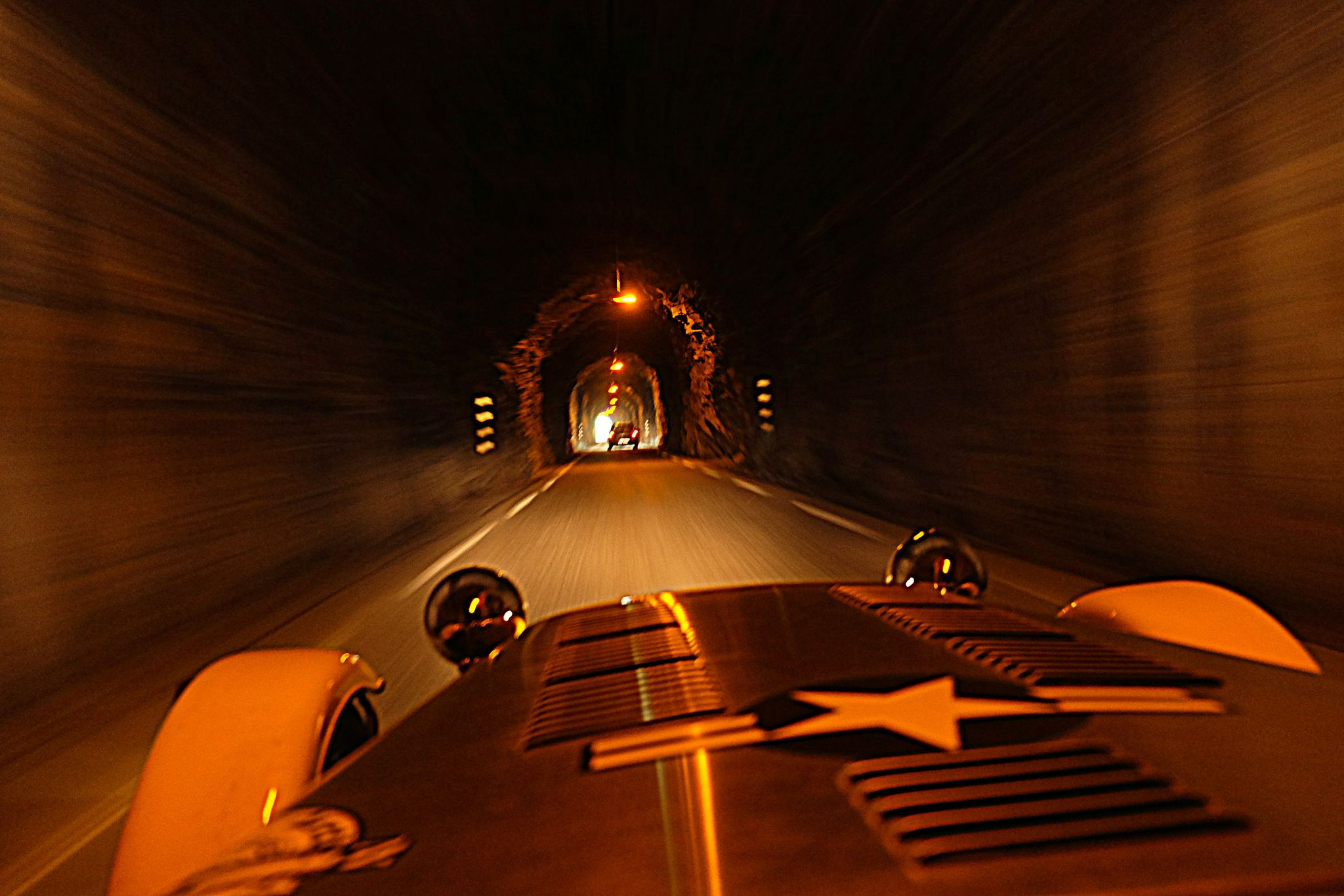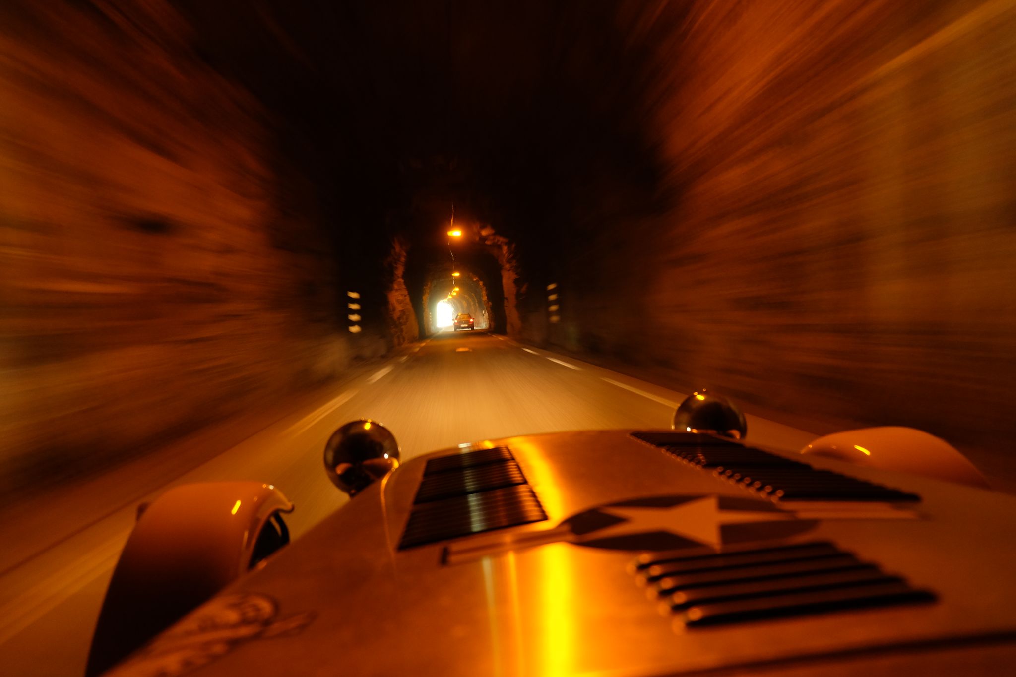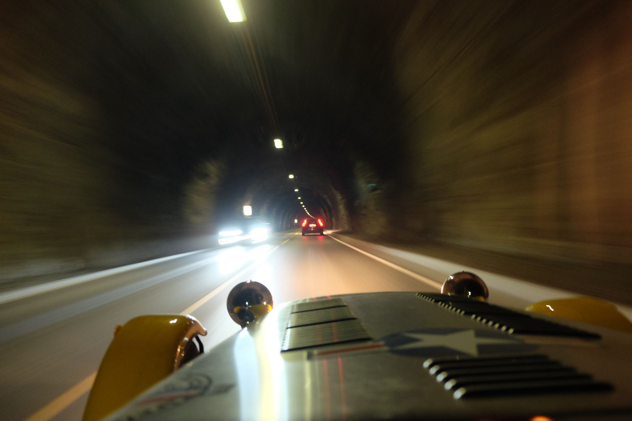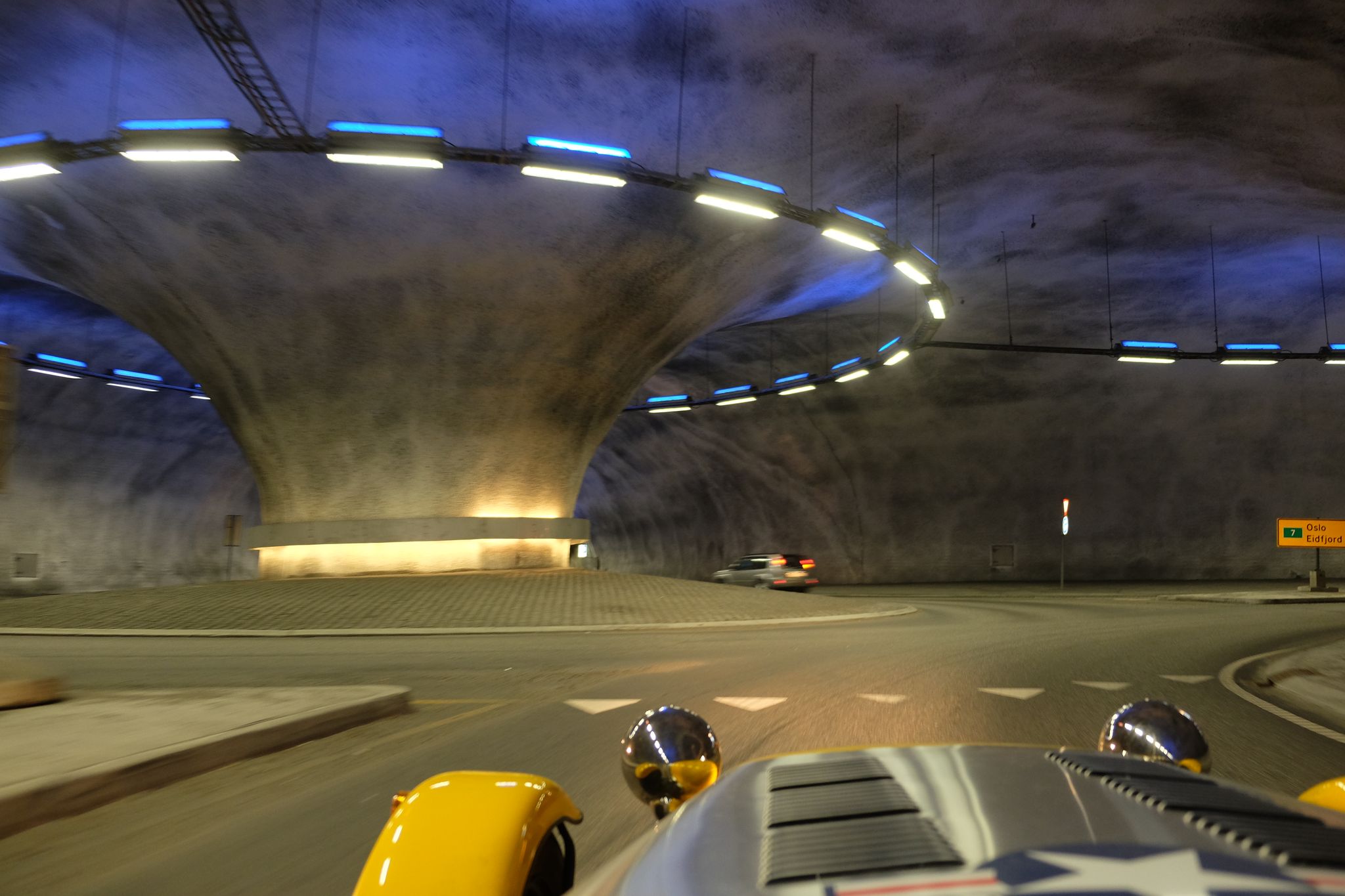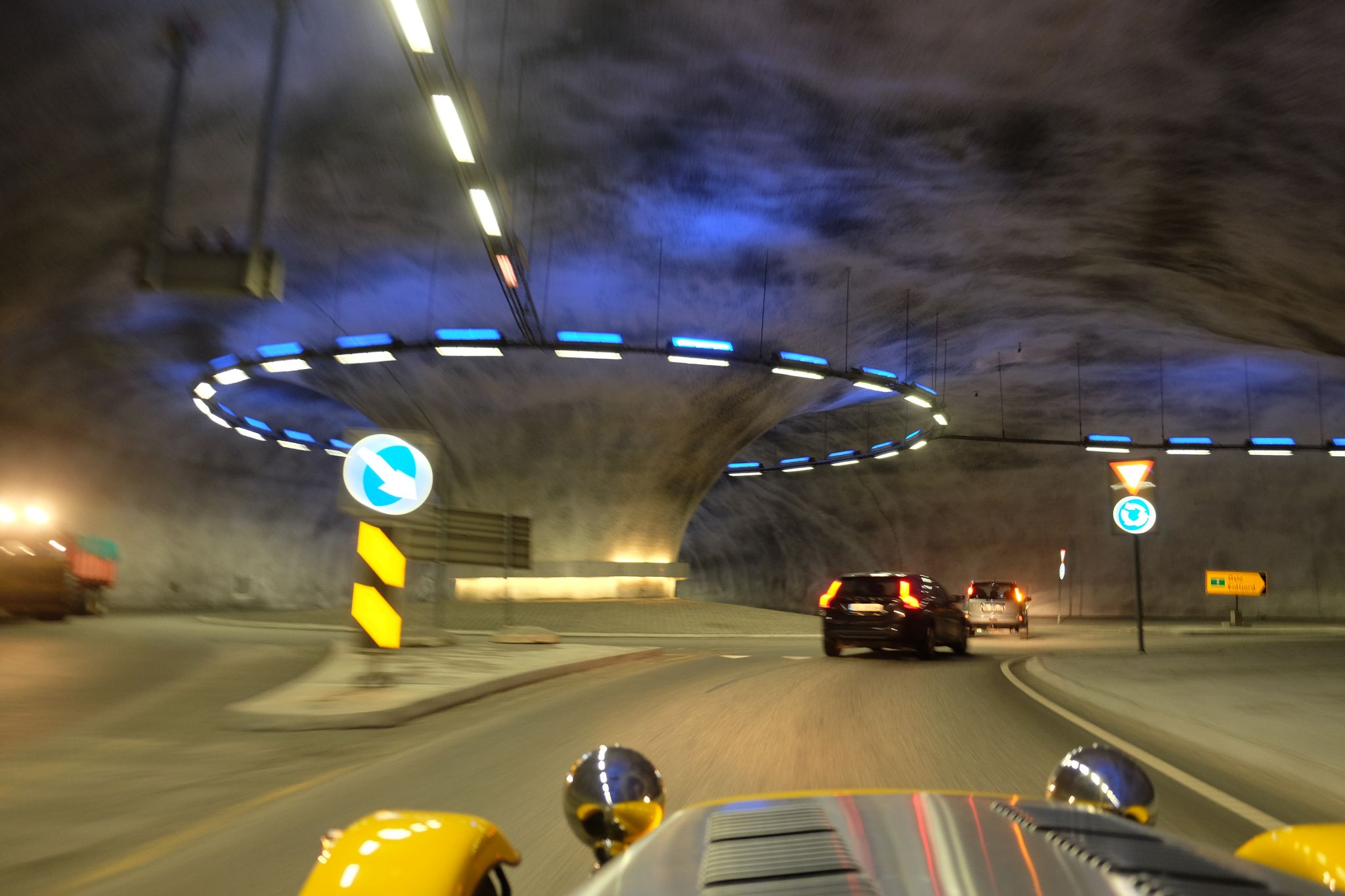 Rencontre du troisième type !! Au loin, je commence à apercevoir au milieu du tunnel des lumières bleues en forme de néons et réparties en forme circulaire, et le support de ces lumières ressemble de plus en plus à une soucoupe volante au fur et à mesure que je me rapproche!! Et je réalise seulement ce que c'est en arrivant dessus, un rond-point!! Un rond-point au beau milieu du tunnel, ils font des trucs de fou ces norvégiens!! Et nouvelle surprise, au moment de m'engager dessus, je jette un coup d'oeil sur le GPS pour savoir où aller, mais merde, je sais très bien que pas de réception dans les tunnels, oui sauf que jamais de problème car il n'y a toujours qu'une route dans un tunnel, sauf en Norvège!!!! Donc au pif, je pars sur la droite, je sors du tunnel peu après pour me retrouver au-dessus d'un fjord en traversant un pont immense, et le GPS a à peine le temps de retrouver le réseau que rebelote, à la sortie du pont, je me réengouffre dans un tunnel, et ils me refont le même coup, le même rond-point au milieu du tunnel!! Et là au pif, je vais tout droit, je ressors peu après, tomtom retrouve le réseau, réinitialise le trajet, et coup de bol, je suis sur la bonne route, que d'aventures !!