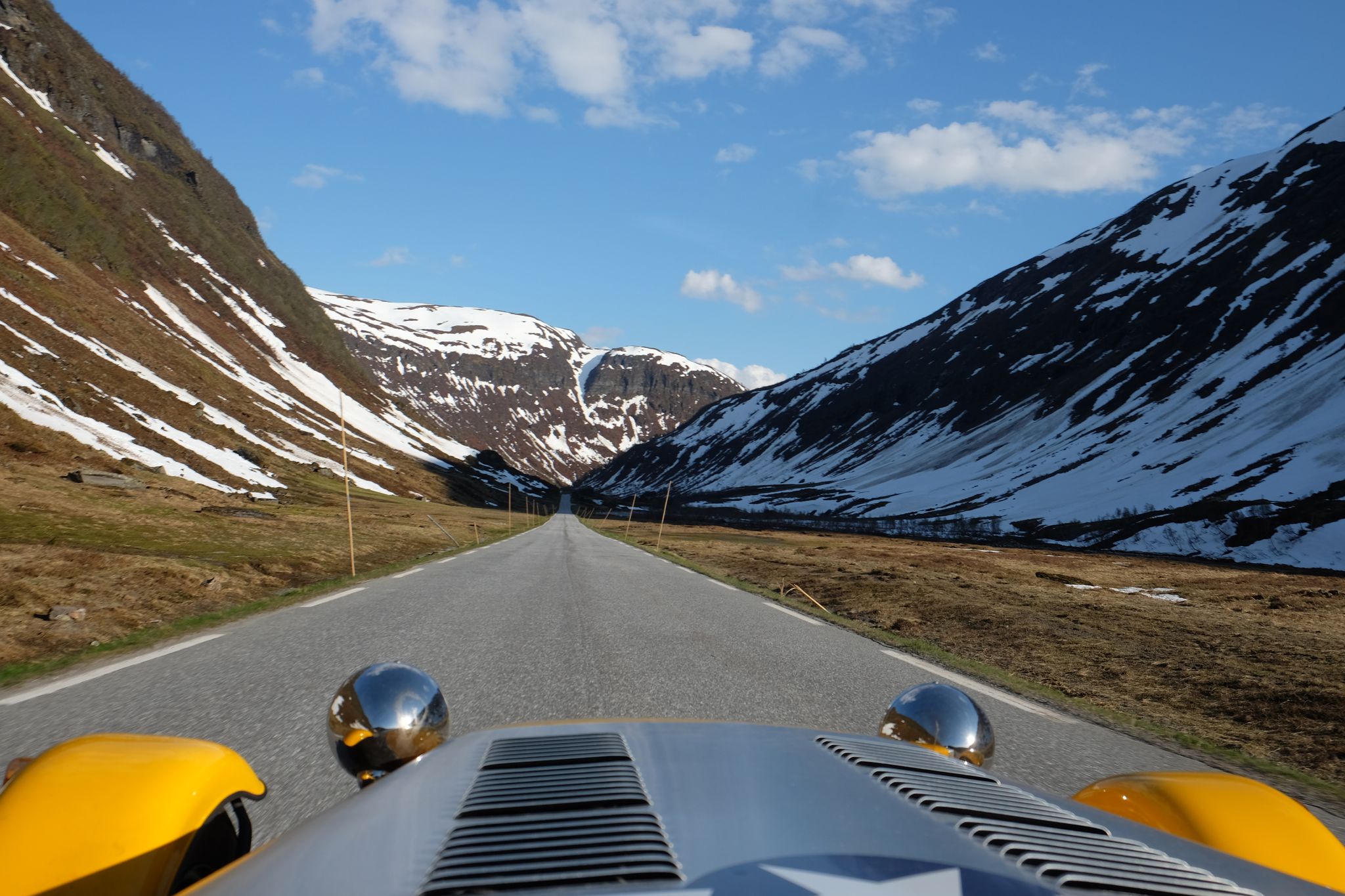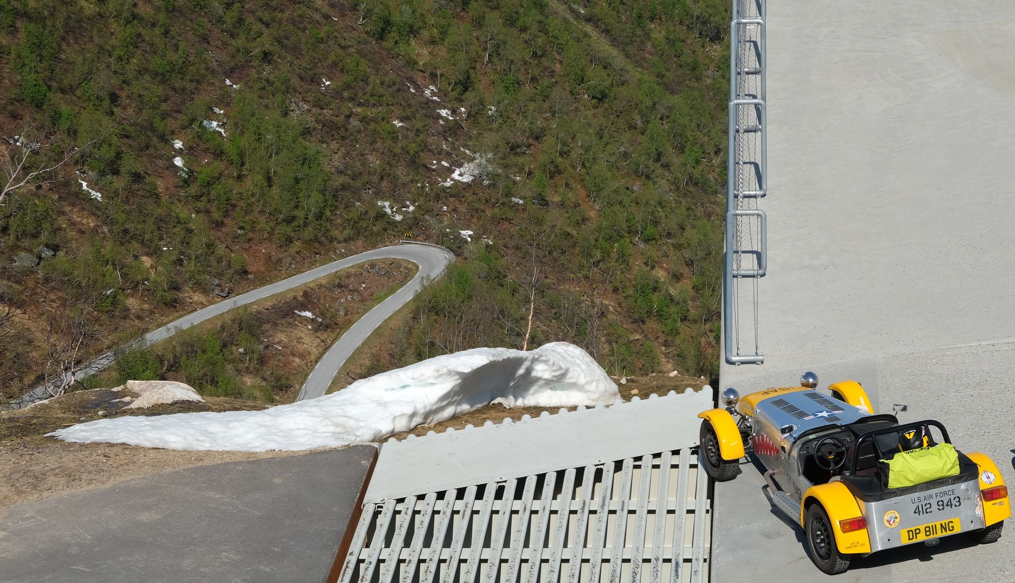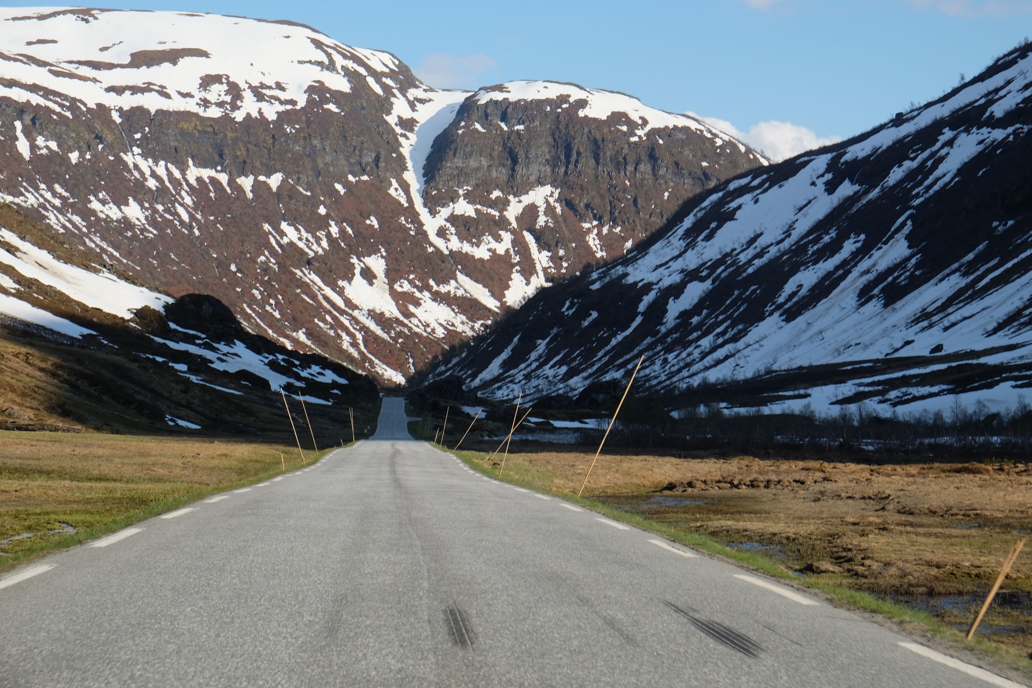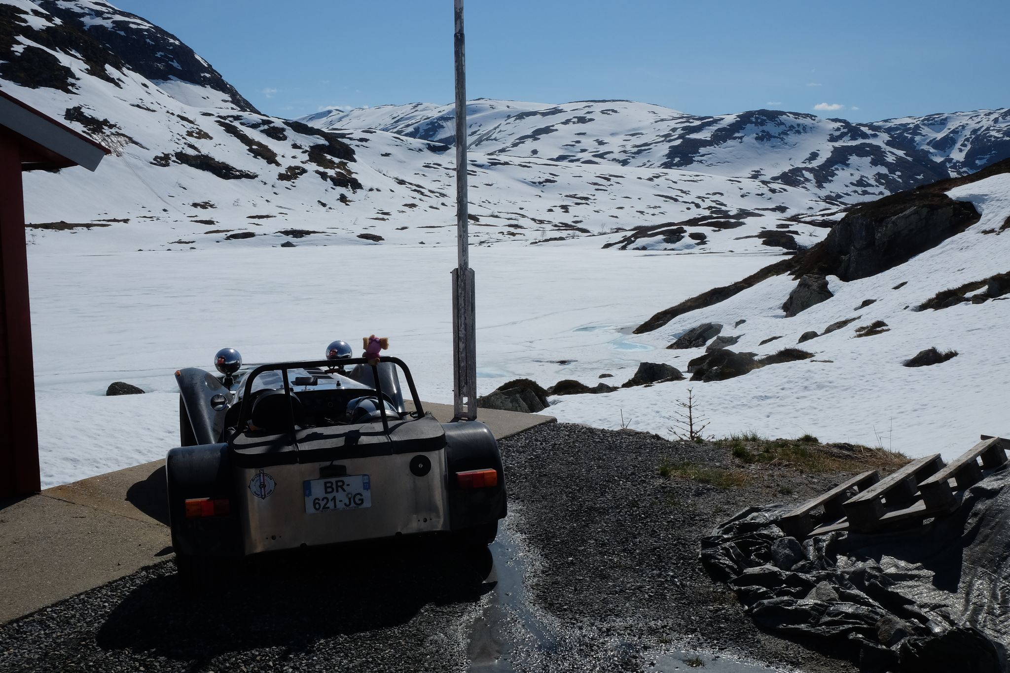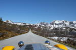 Puis nous continuons à enchaîner sur cette toujours superbe route fv13, montée en altitude et paysage encore blanc immaculé, descente en lacets qui nous rappelle un peu nos chères Alpes, l'asphalte serpentant le long des fjords, que du bonheur .... Puis, au détour d'un des nombreux tunnels empruntés, un truc de fou, je ne m'y attendais pas, et j'hallucinais et jubilais dans mon casque !!