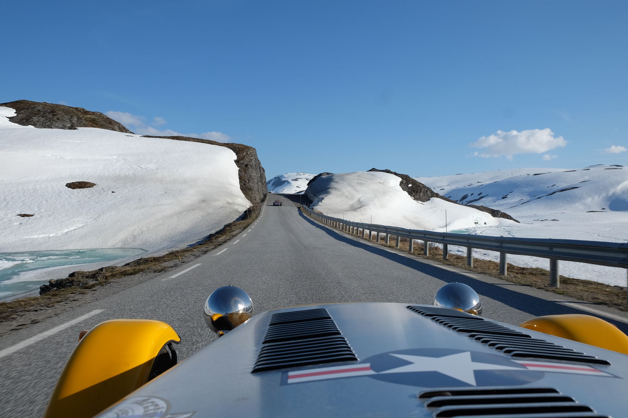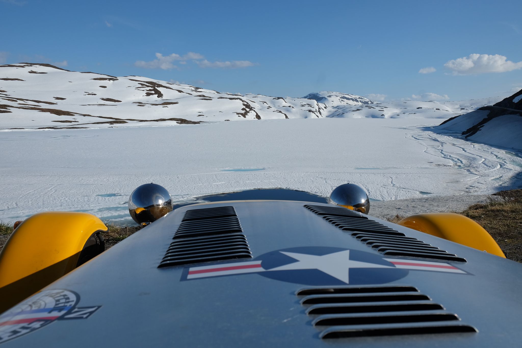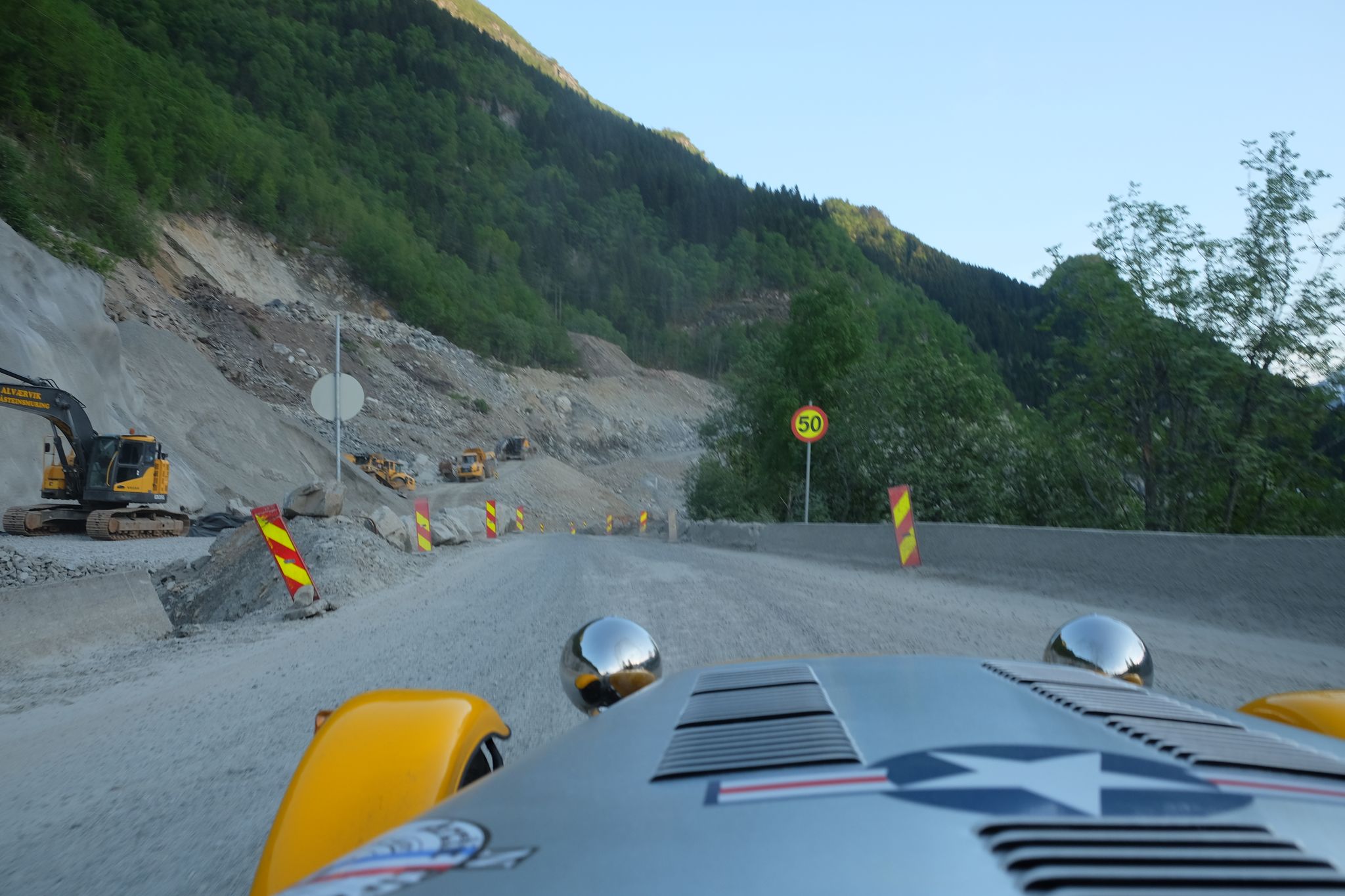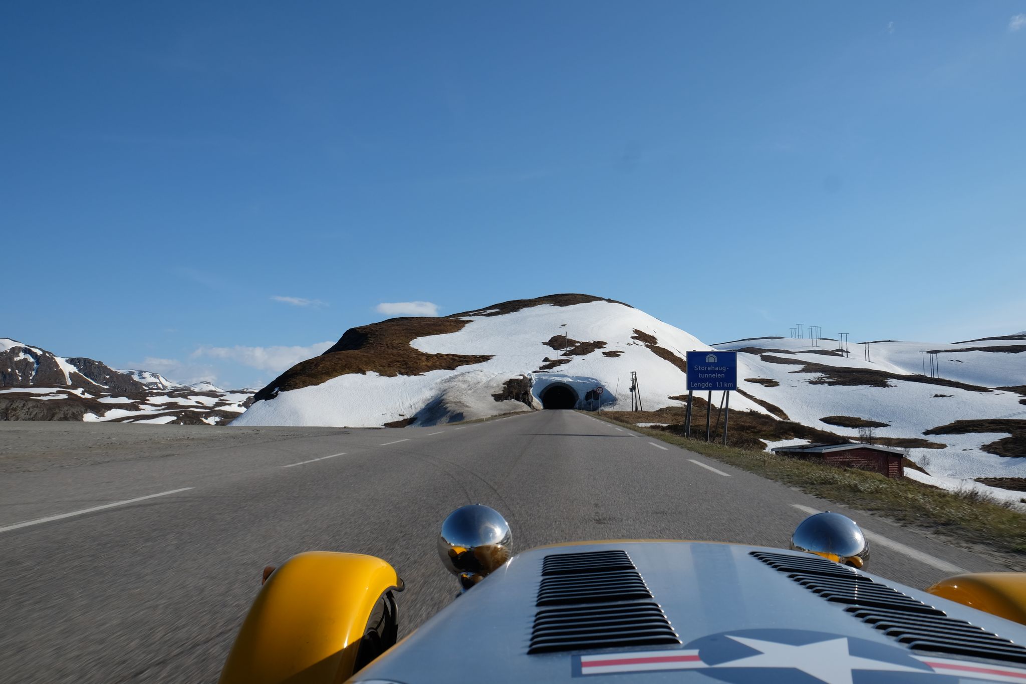 Puis nous continuons à enchaîner sur cette toujours superbe route fv13, montée en altitude et paysage encore blanc immaculé, descente en lacets qui nous rappelle un peu nos chères Alpes, l'asphalte serpentant le long des fjords, que du bonheur .... Puis, au détour d'un des nombreux tunnels empruntés, un truc de fou, je ne m'y attendais pas, et j'hallucinais et jubilais dans mon casque !!