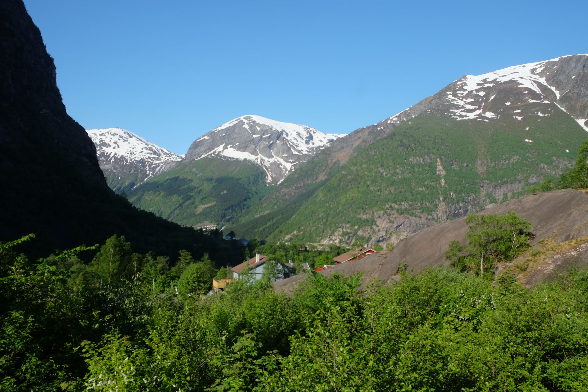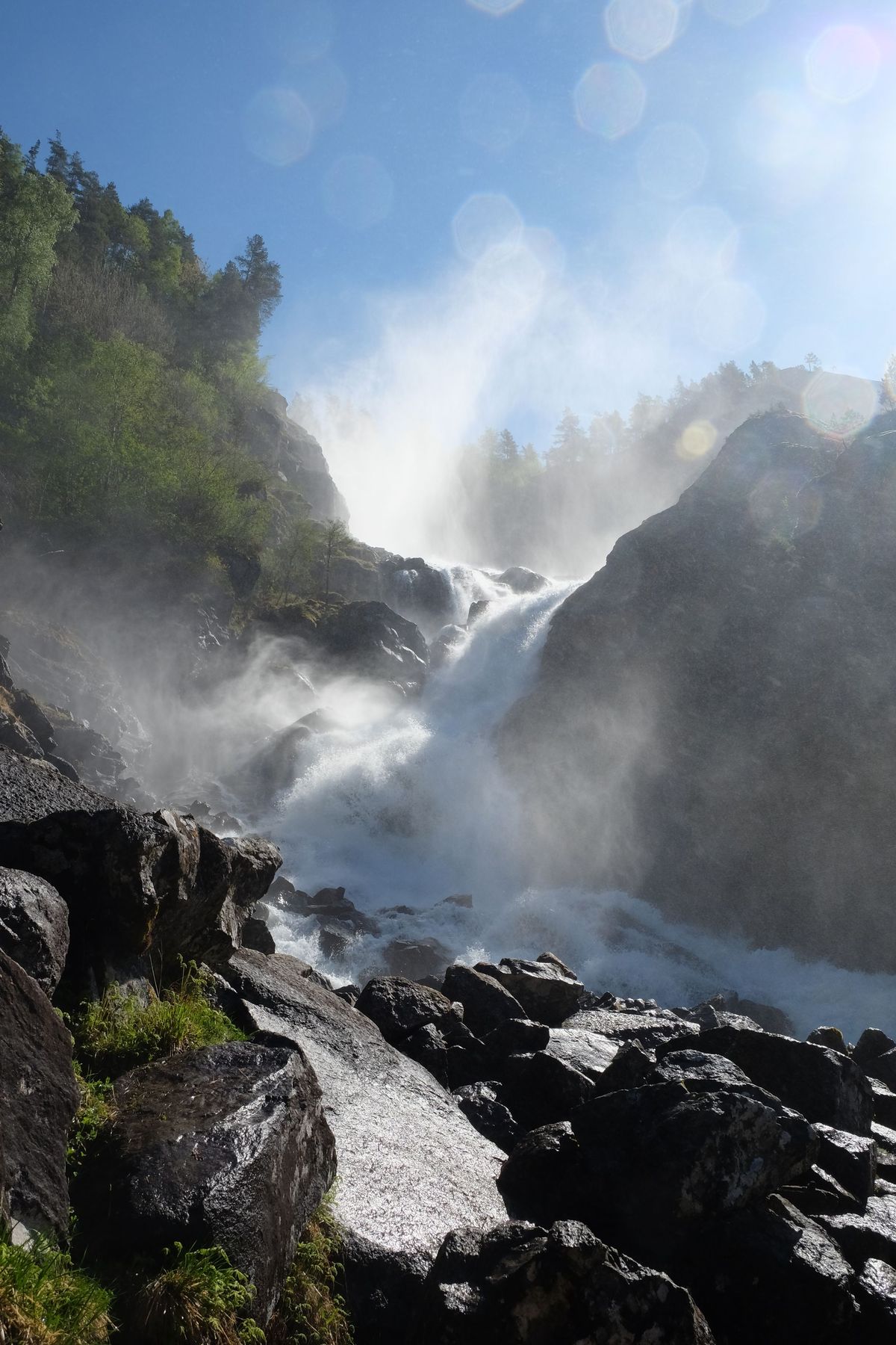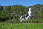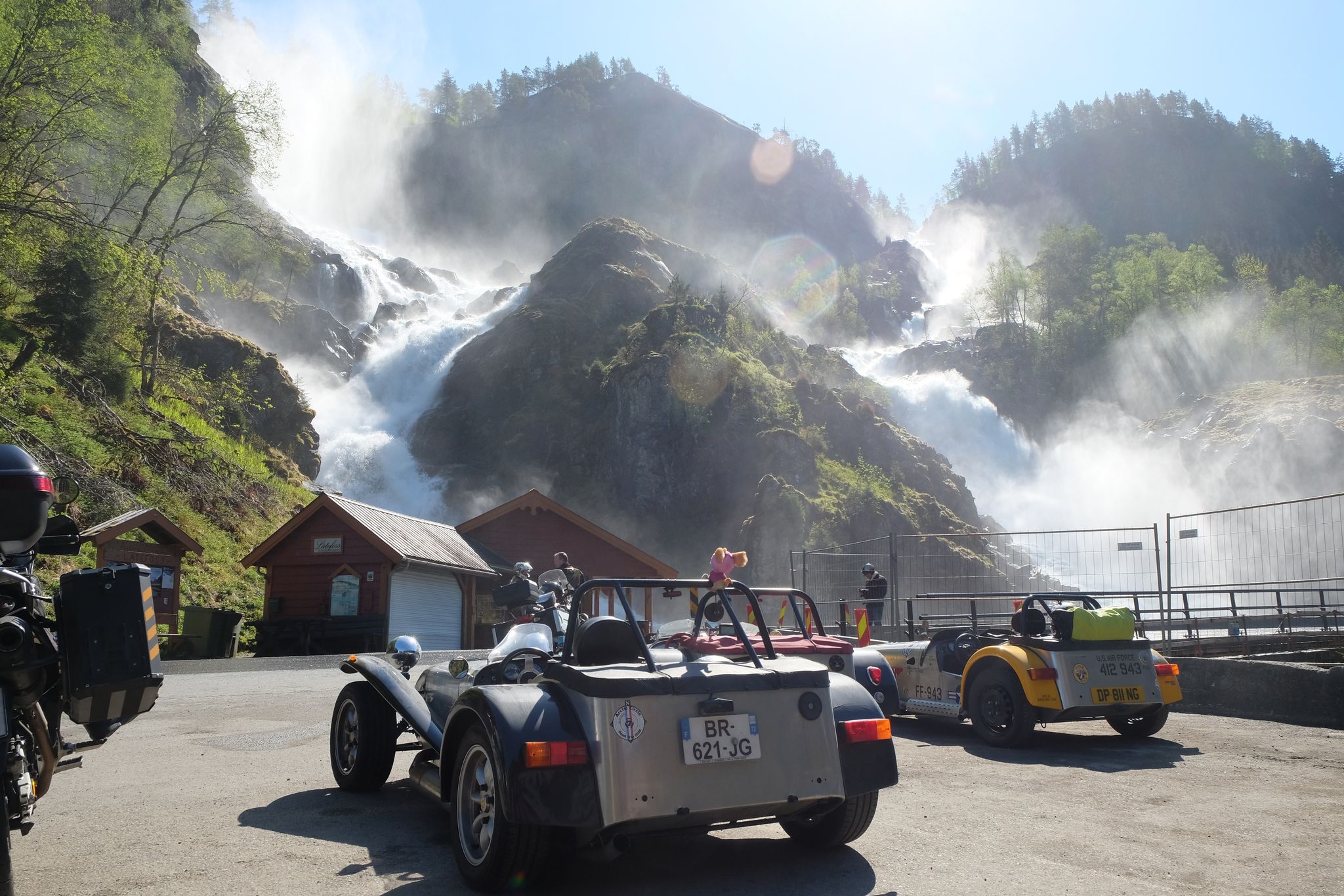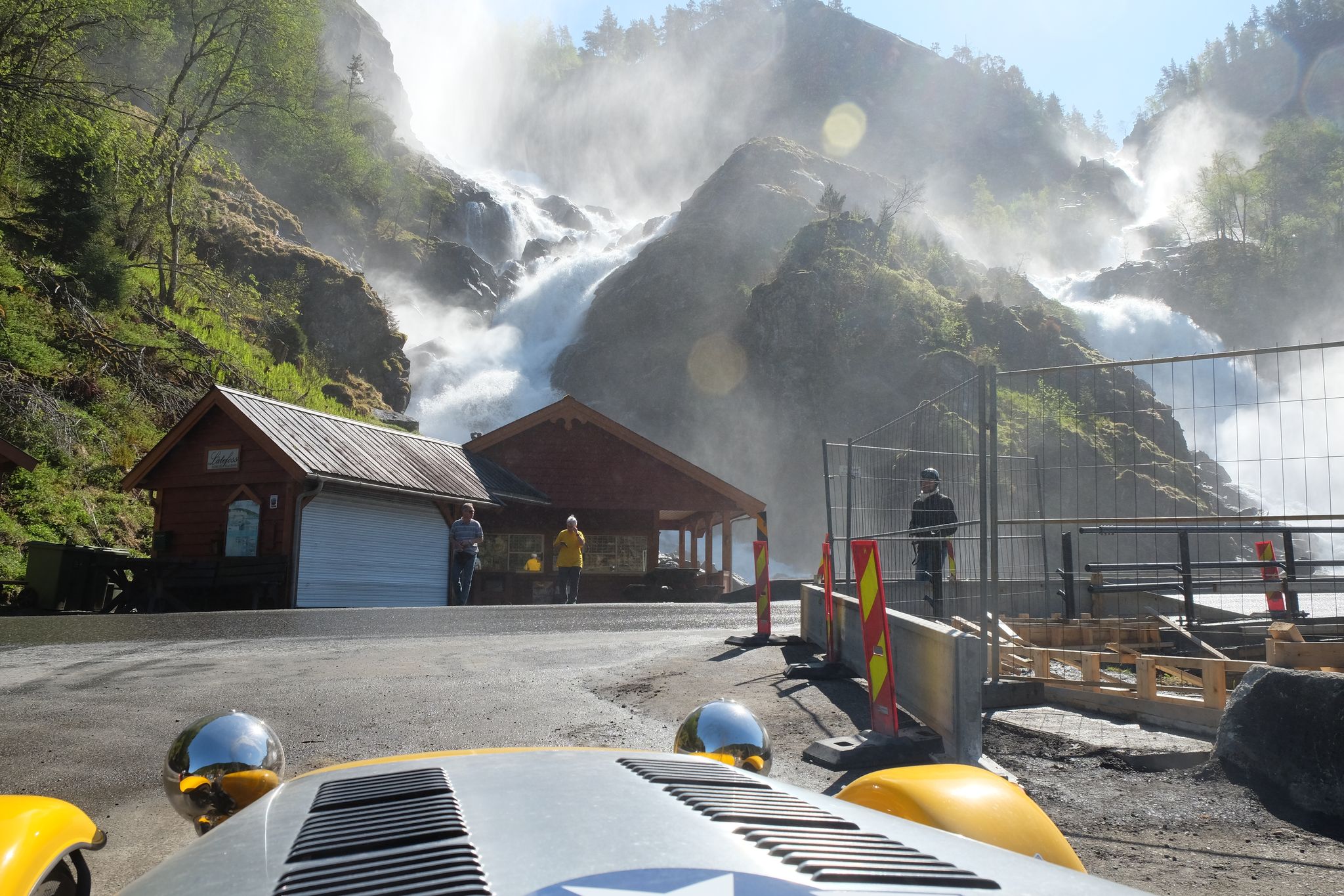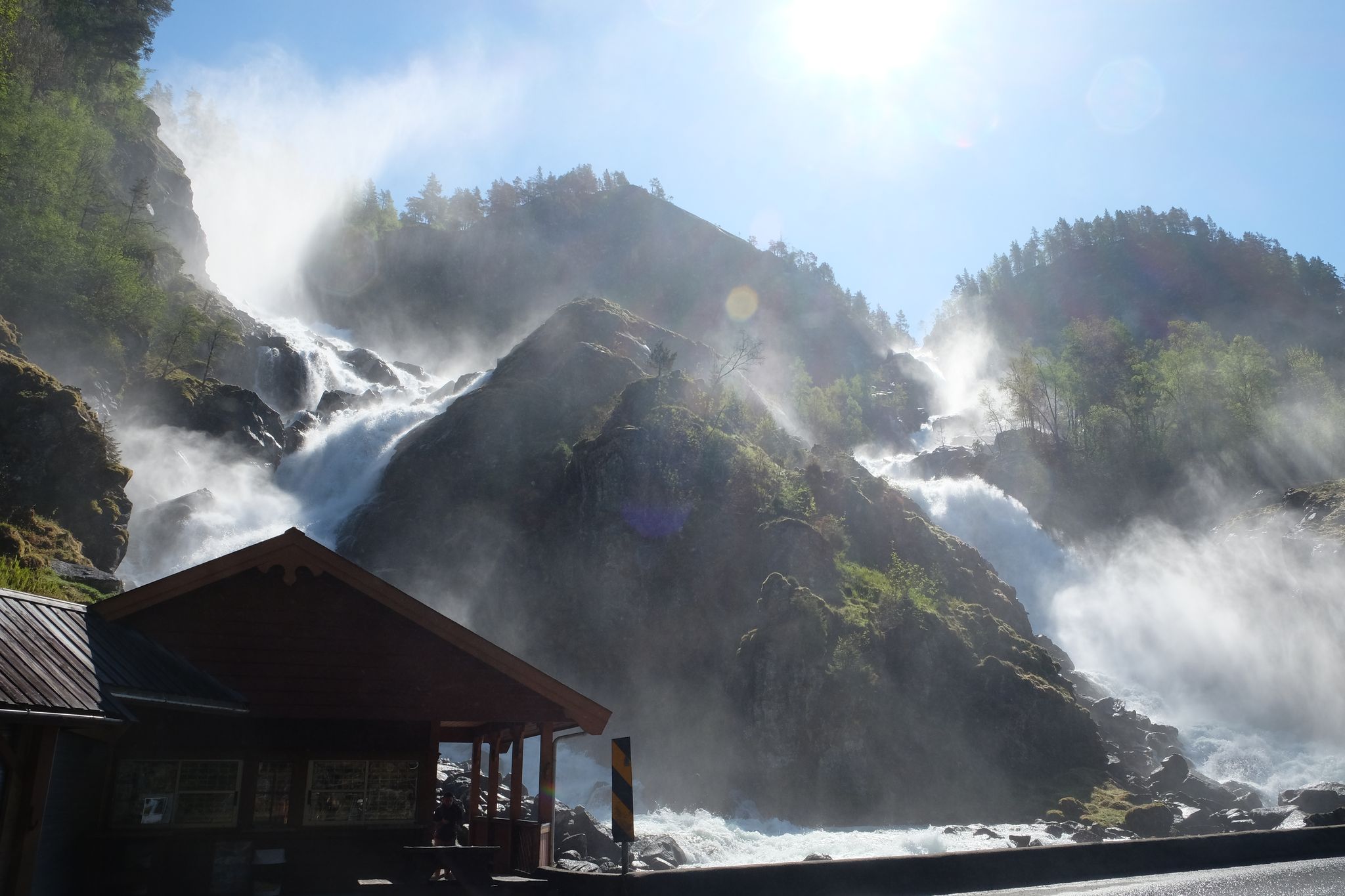 Puis nous longeons le petit fjord de Sandvevatnet, qui se transforme en un gros torrent le Gronsdalslona, et nous arrivons à une autre merveille puissante de la Norvège, les chutes de Latefossen, qui chutent quasiment sur la route! Le débit et la force sont assez impressionnants, et c'est douche assurée en traversant le pont de pierre !!