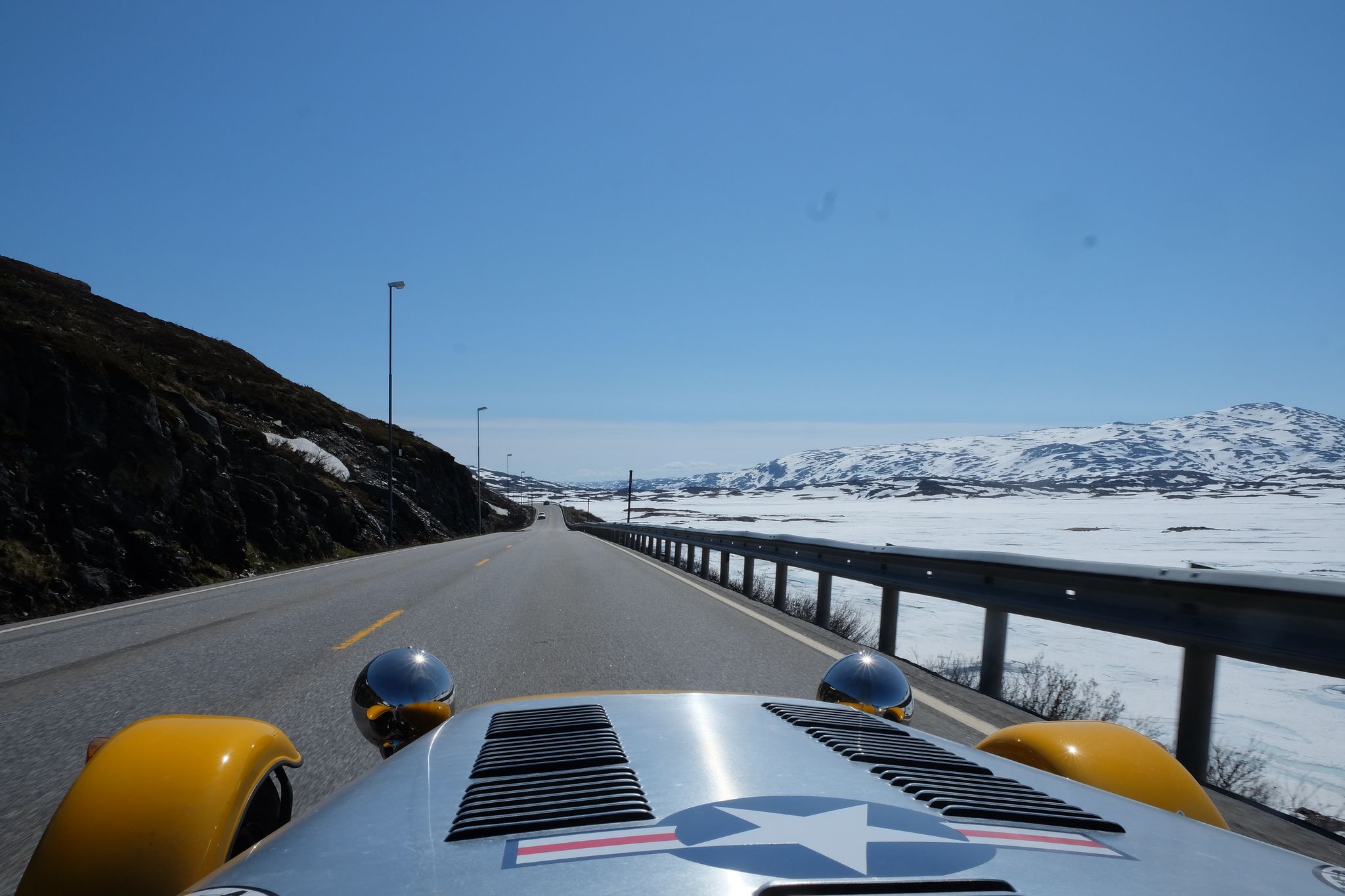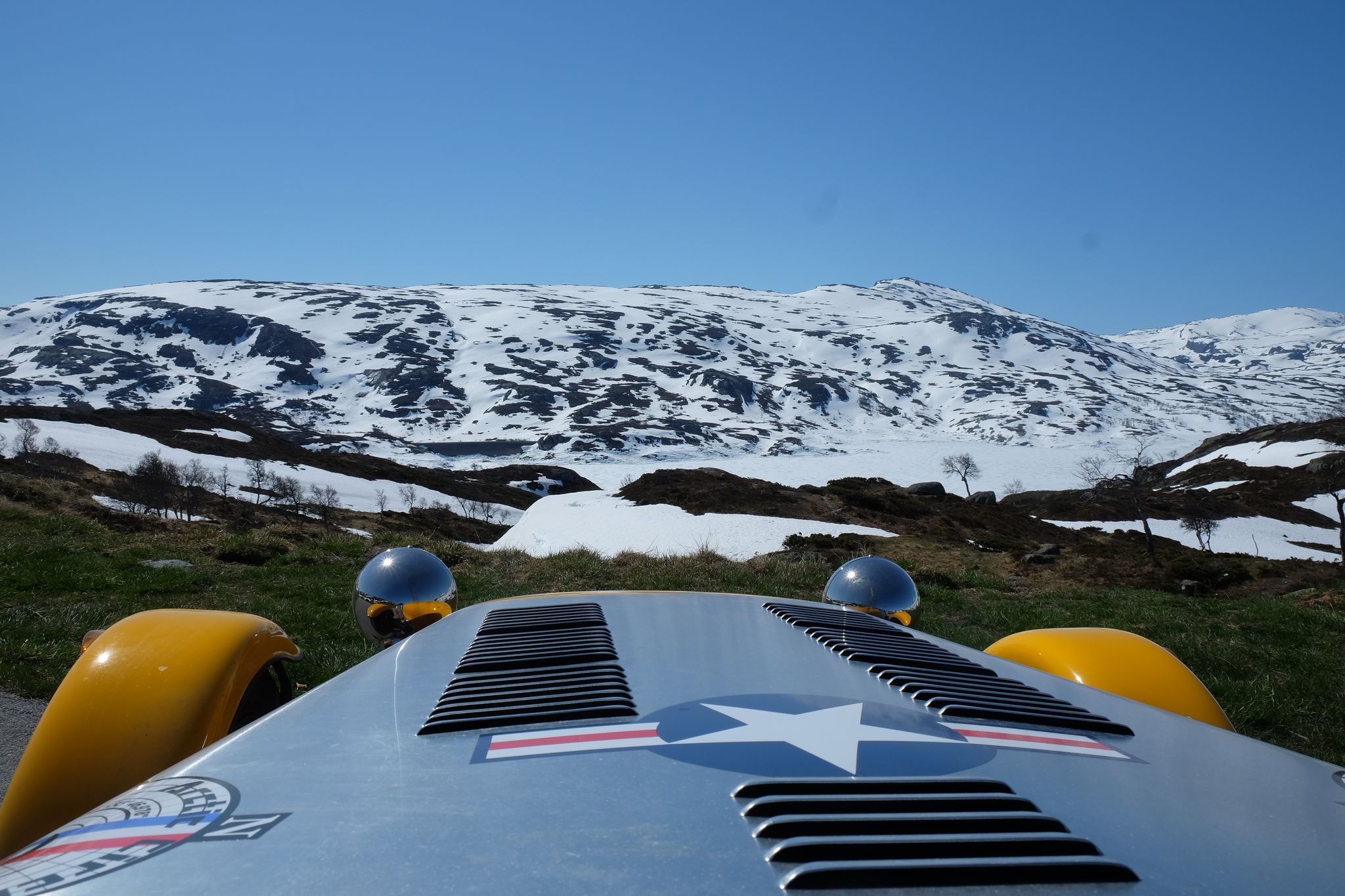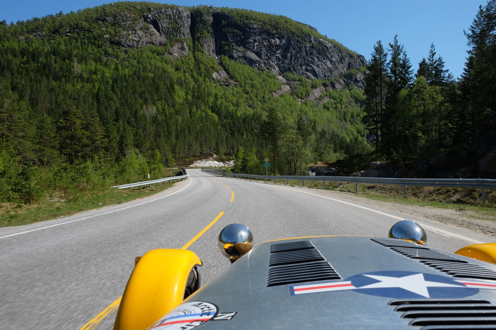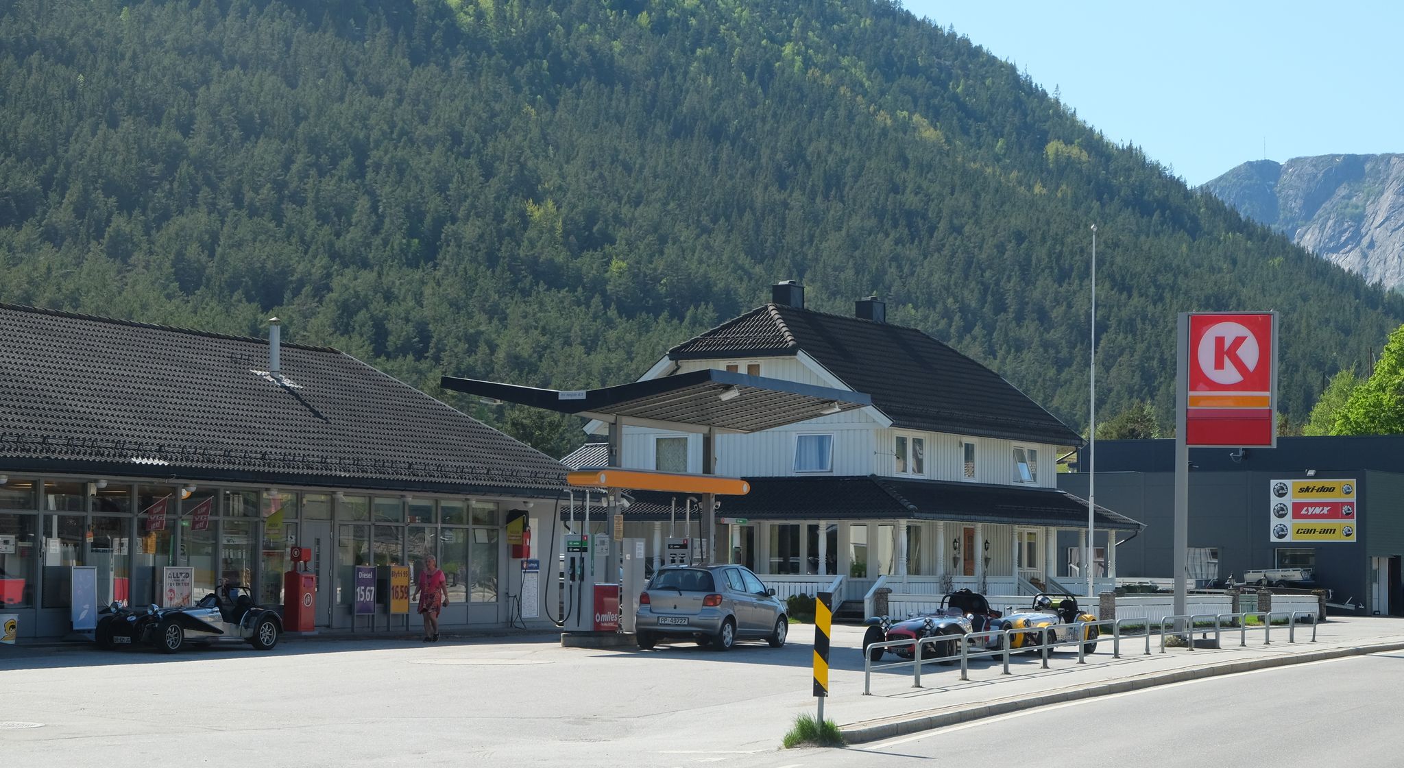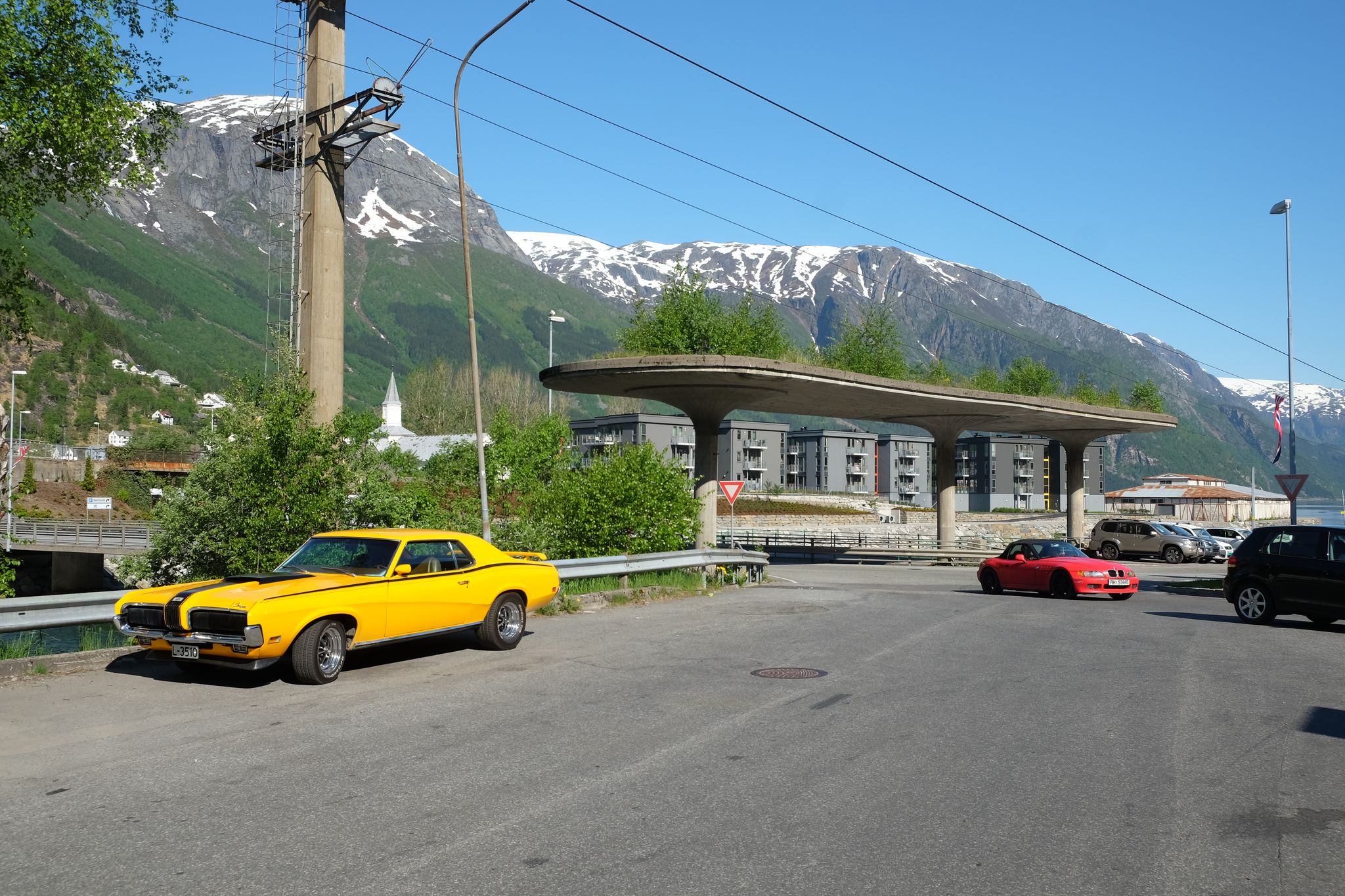 C'est le week end et c'est aussi le dernier jour en Norvège.... Grand soleil pour changer, un bon petit déjeuner dans la maison d'Elisabeth Michelle et nous quittons Tyssedal, direction toujours plein sud vers la mer ! Un long tunnel à la sortie de Tyssedal, et nous continuons à longer ce beau Hardangerfjorden très encaissé, bordé de hautes falaises et qui offre ainsi de fabuleuses cascades. Arrêt ravitaillement pour les Cat en arrivant sur Odda, en choisissant La station où l'on découvre une superbe Mercury Cougar XR7 1970 jaune pimpant, génial !!