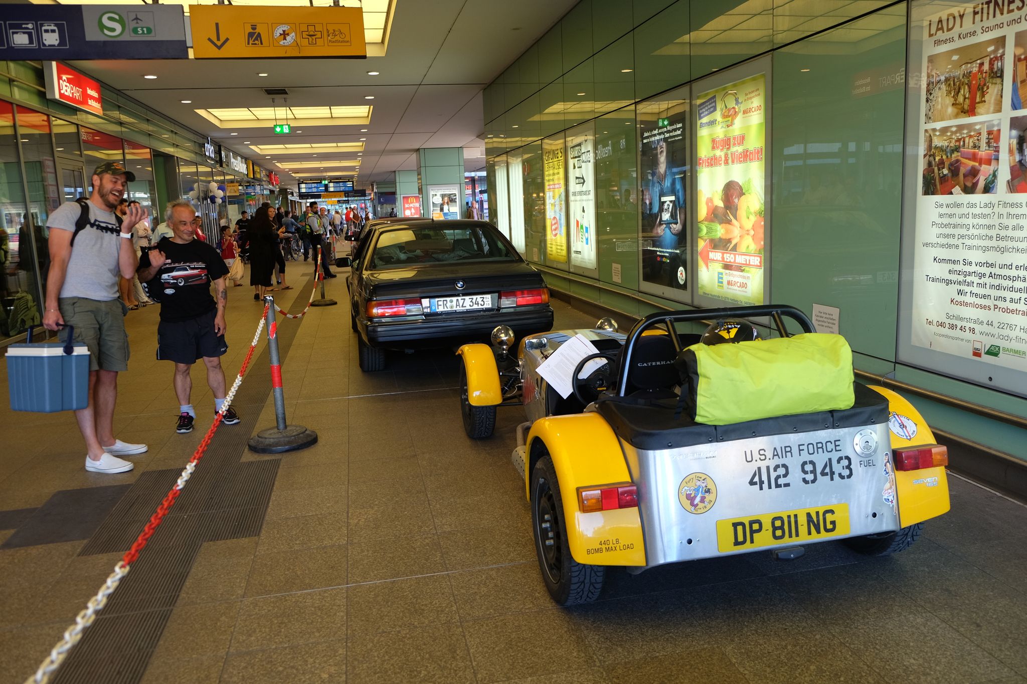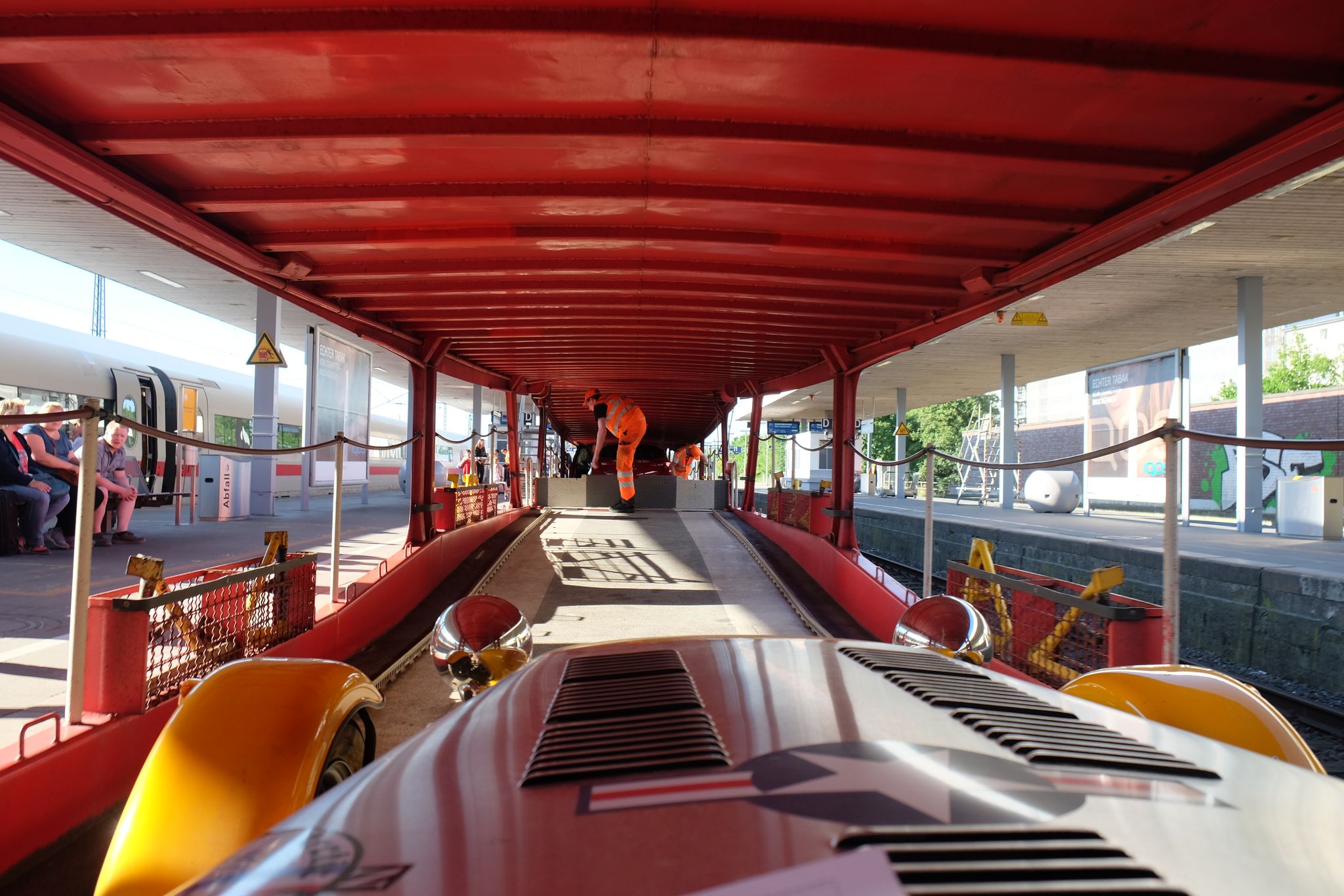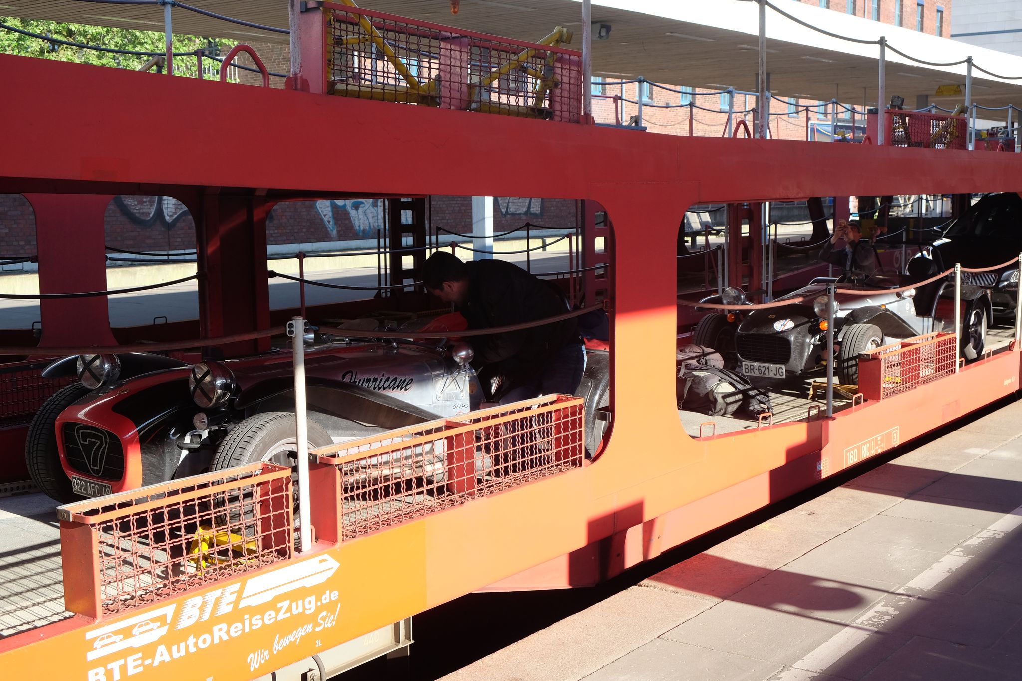 Puis traversée intégrale du Danemark, et de la partie nord de l'Allemagne, autoroute, morne, chiant, sans intérêt, mais il fallait le faire pour rentrer chez nous ! Et comme à l'allée, nous refaisons la traversée de nuit en train-auto, donc nous arrivons sur Hambourg, c'est dimanche donc heureusement la circulation est fluide, je trouve cette fois directement l'endroit pour embarquer, mais il y a déjà une file d'attente, avec une nouvelle fois des jolies voitures, mais ça n'avance pas au guichet, nous bloquons un peu la route, un camion essaie un peu de forcer, les esprits s'échauffent un peu, mais je finis enfin par passer, et l'amusement de retraverser une nouvelle fois la galerie marchande, derrière une BMW série 6 et d'embarquer sur le train, où nous retrouvons avec plaisir notre hôtesse de l'aller, qui nous avait bien choyé ;-)