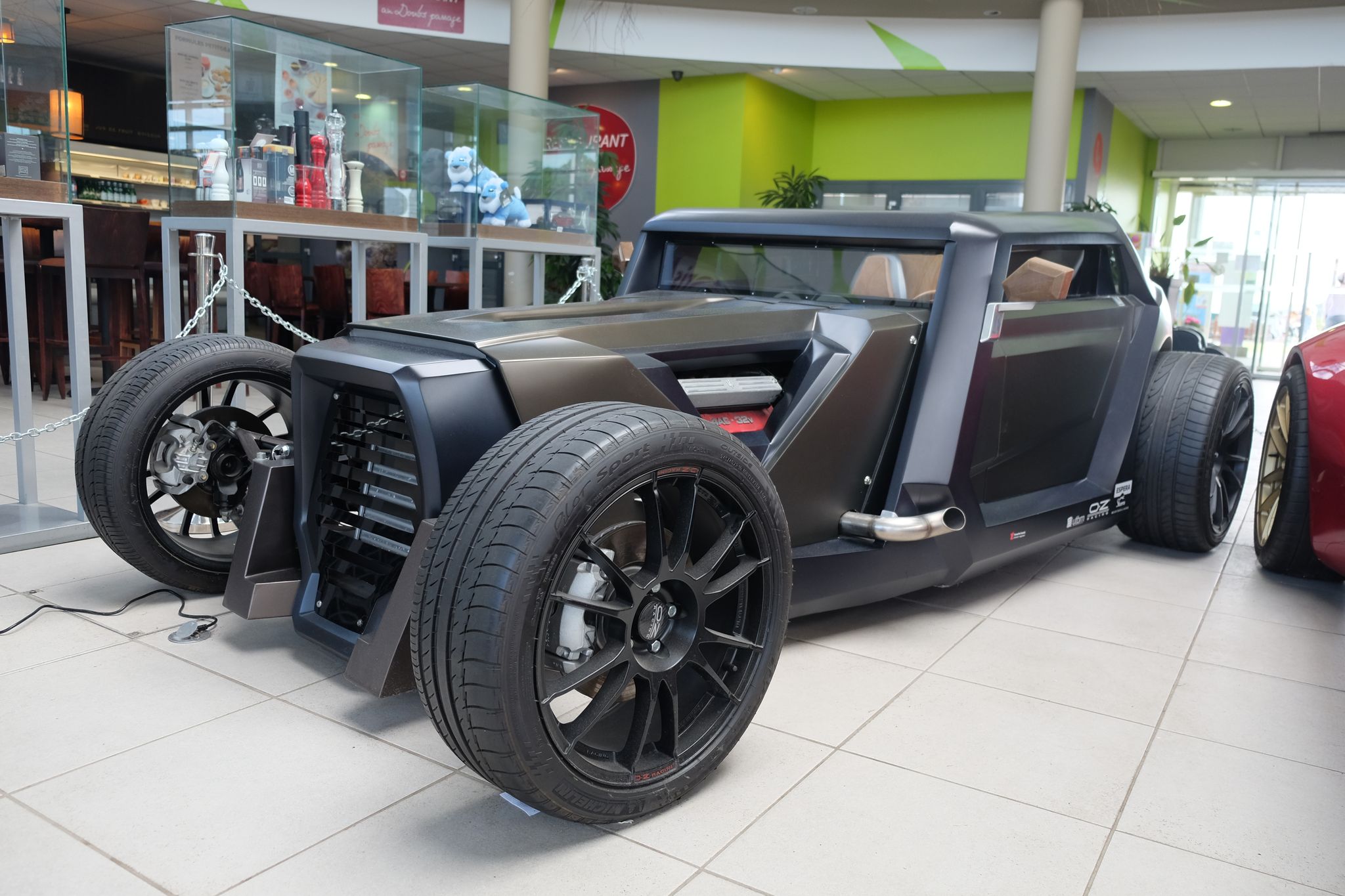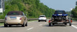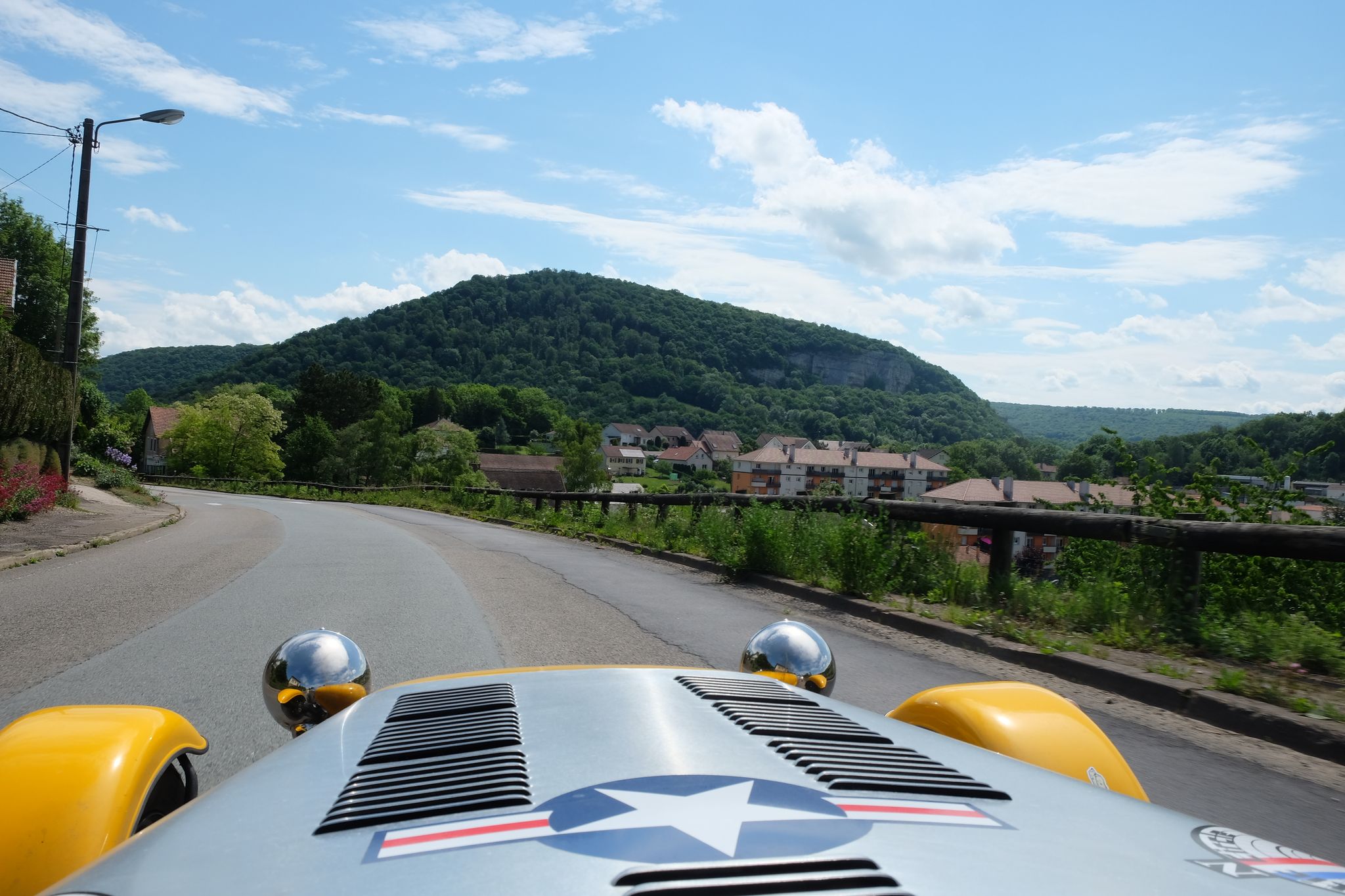Nous franchissons le Rhin à la sortie de Lorrach, et reprenons rapidement l'autoroute à la sortie de Basel, pour pénétrer en France quelques kilomètres plus loin à la hauteur de Mulhouse. Les deux autres Cat m'ont déjà larguées depuis longtemps, car ça me gave déjà de rouler sur l'autoroute, et je me traîne ! Et comme j'en ai déjà marre, je fais une halte sur une aire d'autoroute vers Montbéliart, et coup de bol, la même qu'à l'aller où il y avait les deux fantastiques Sbarro en exposition (Miglia et Eight Hot Rod) que cette fois je prends le temps de photographier. Et sitôt repris, je craque et quitte définitivement l'autoroute et décide de tailler tout droit dans la campagne pour traverser la France .... la campagne est belle, et même après quinze jours de Cat, c'est toujours du plaisir de rouler .... et les nuages commencent à devenir noir droit devant, je m'arrête dare-dare pour enfiler la combi moto intégrale pour continuer à rouler et je me prends un orage comme je n'en avais jamais pris, mais je continue, surtout que le temps se dégage, et à l'approche de la maison, j'ai même droit à un beau coucher de soleil pour tenir le cap, il est près de 22h00, je roule depuis douze heures et je suis en approche finale ....